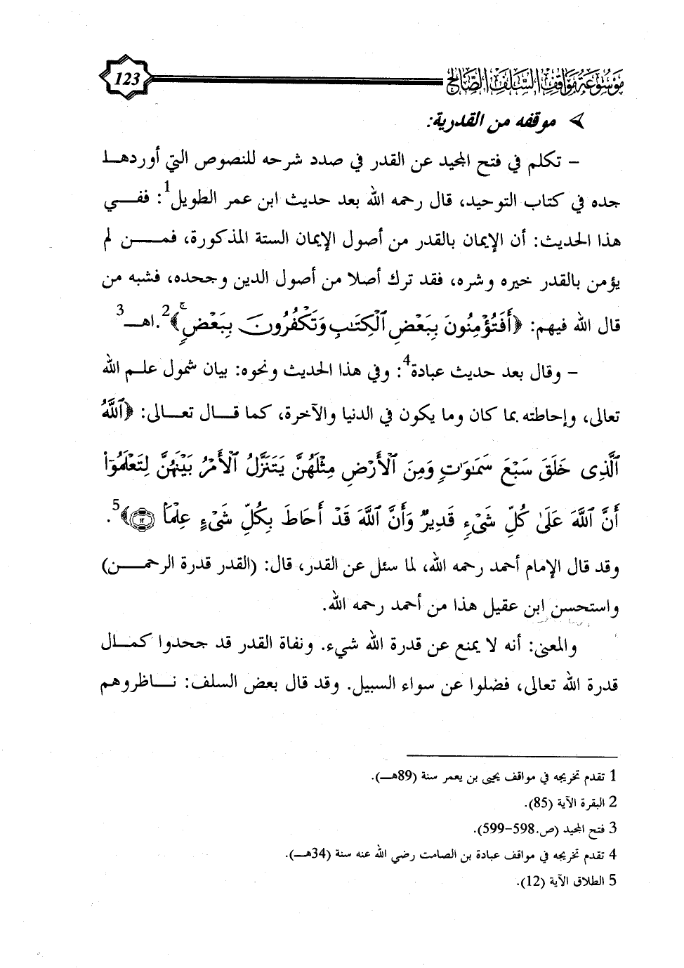 - تكلم في فتح المجيد عن القدر في صدد شرحه للنصوص التي أوردها جده في كتاب التوحيد، قال رحمه الله بعد حديث ابن عمر الطويل (¬1): ففي هذا الحديث: أن الإيمان بالقدر من أصول الإيمان الستة المذكورة، فمن لم يؤمن بالقدر خيره وشره، فقد ترك أصلا من أصول الدين وجحده، فشبه من قال الله فيهم: {أَفَتُؤْمِنُونَ بِبَعْضِ الْكِتَابِ وَتَكْفُرُونَ بِبَعْضٍ} (¬2).اهـ (¬3)