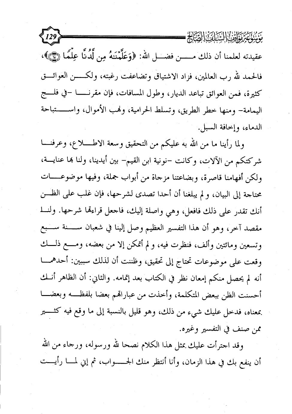 عقيدته لعلمنا أن ذلك من فضل الله: {وَعَلَّمْنَاهُ مِنْ لَدُنَّا عِلْمًا (65)}، فالحمد لله رب العالمين، فزاد الاشتياق وتضاعفت رغبته، ولكن العوائق كثيرة، فمن العوائق تباعد الديار، وطول المسافات، فإن مقرنا -في فلج اليمامة- ومنها خطر الطريق، وتسلط الحرامية، ونهب الأموال، واستباحة الدماء، وإخافة السبل.