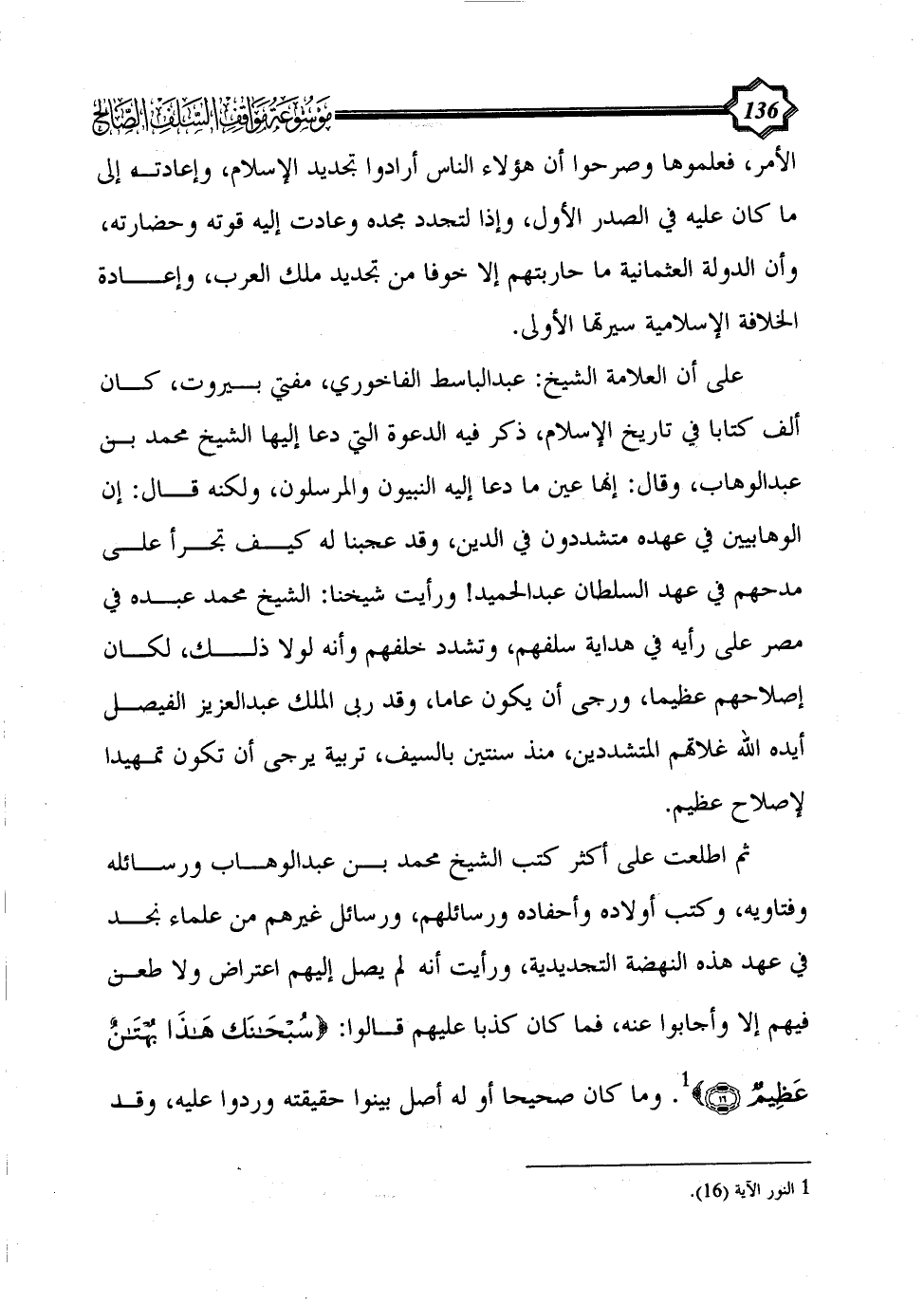 ثم اطلعت على أكثر كتب الشيخ محمد بن عبد الوهاب ورسائله وفتاويه، وكتب أولاده وأحفاده ورسائلهم، ورسائل غيرهم من علماء نجد في عهد هذه النهضة التجديدية، ورأيت أنه لم يصل إليهم اعتراض ولا طعن فيهم إلا وأجابوا عنه، فما كان كذبا عليهم قالوا: {سبحانك هَذَا بُهْتَانٌ عَظِيمٌ (16)} (¬1). وما كان صحيحا أو له أصل بينوا حقيقته وردوا عليه، وقد