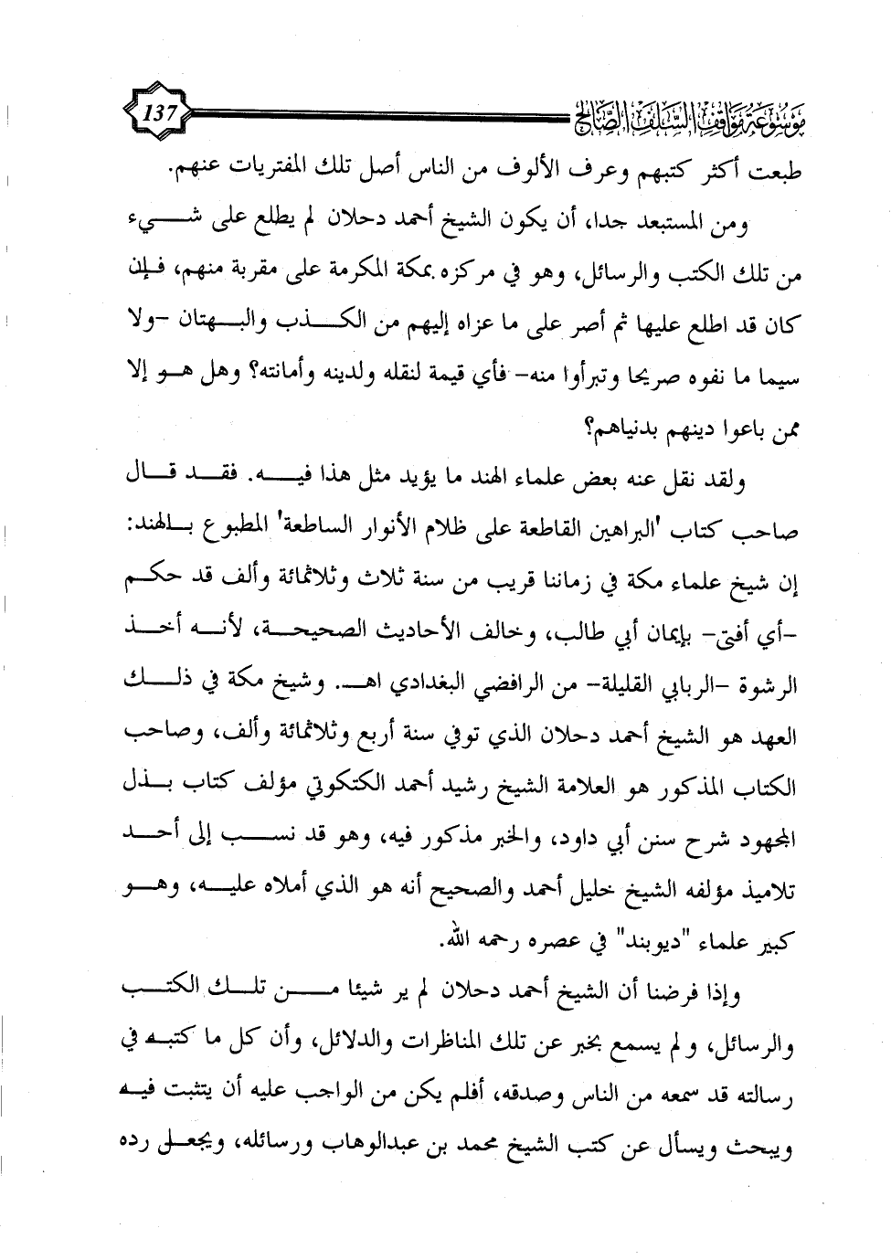ومن المستبعد جدا، أن يكون الشيخ أحمد دحلان لم يطلع على شيء من تلك الكتب والرسائل، وهو في مركزه بمكة المكرمة على مقربة منهم، فإن كان قد اطلع عليها ثم أصر على ما عزاه إليهم من الكذب والبهتان -ولا سيما ما نفوه صريحا وتبرأوا منه- فأي قيمة لنقله ولدينه وأمانته؟ وهل هو إلا ممن باعوا دينهم بدنياهم؟