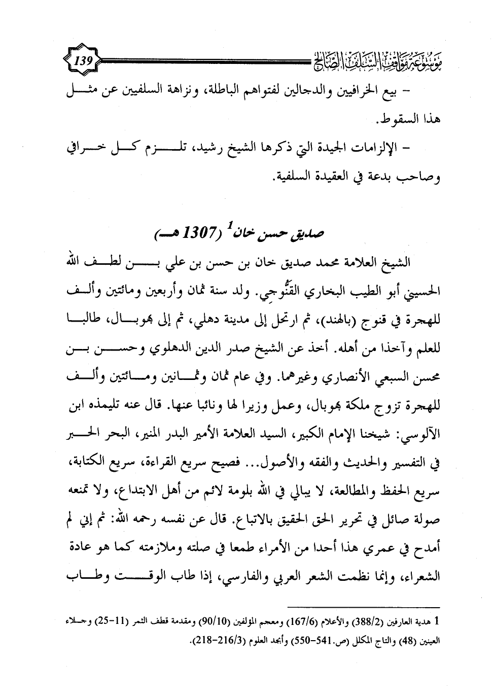 الشيخ العلامة محمد صديق خان بن حسن بن علي بن لطف الله الحسيني أبو الطيب البخاري القَنُّوجِي. ولد سنة ثمان وأربعين ومائتين وألف للهجرة في قنوج (بالهند)، ثم ارتحل إلى مدينة دهلي، ثم إلى بهوبال، طالبا للعلم وآخذا من أهله. أخذ عن الشيخ صدر الدين الدهلوي وحسن بن محسن السبعي الأنصاري وغيرهما. وفي عام ثمان وثمانين ومائتين وألف للهجرة تزوج ملكة بهوبال، وعمل وزيرا لها ونائبا عنها. قال عنه تليمذه ابن الآلوسي: شيخنا الإمام الكبير، السيد العلامة الأمير البدر المنير، البحر الحبر في التفسير والحديث والفقه والأصول ... فصيح سريع القراءة، سريع الكتابة، سريع الحفظ والمطالعة، لا يبالي في الله بلومة لائم من أهل الابتداع، ولا تمنعه صولة صائل في تحرير الحق الحقيق بالاتباع. قال عن نفسه رحمه الله: ثم إني لم أمدح في عمري هذا أحدا من الأمراء طمعا في صلته وملازمته كما هو عادة الشعراء، وإنما نظمت الشعر العربي والفارسي، إذا طاب الوقت وطاب