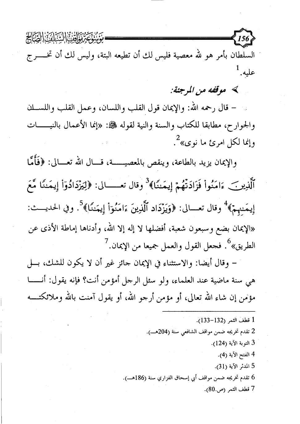 والإيمان يزيد بالطاعة، وينقص بالمعصية، قال الله تعالى: {فَأَمَّا الَّذِينَ آَمَنُوا فَزَادَتْهُمْ إِيمَانًا} (¬3) وقال تعالى: {لِيَزْدَادُوا إِيمَانًا مَعَ إِيمَانِهِمْ} (¬4) وقال تعالى: {ويزداد الَّذِينَ آَمَنُوا إِيمَانًا} (¬5). وفي الحديث: «الإيمان بضع وسبعون شعبة، أفضلها لا إله إلا الله، وأدناها إماطة الأذى عن الطريق» (¬6). فجعل القول والعمل جميعاً من الإيمان. (¬7)