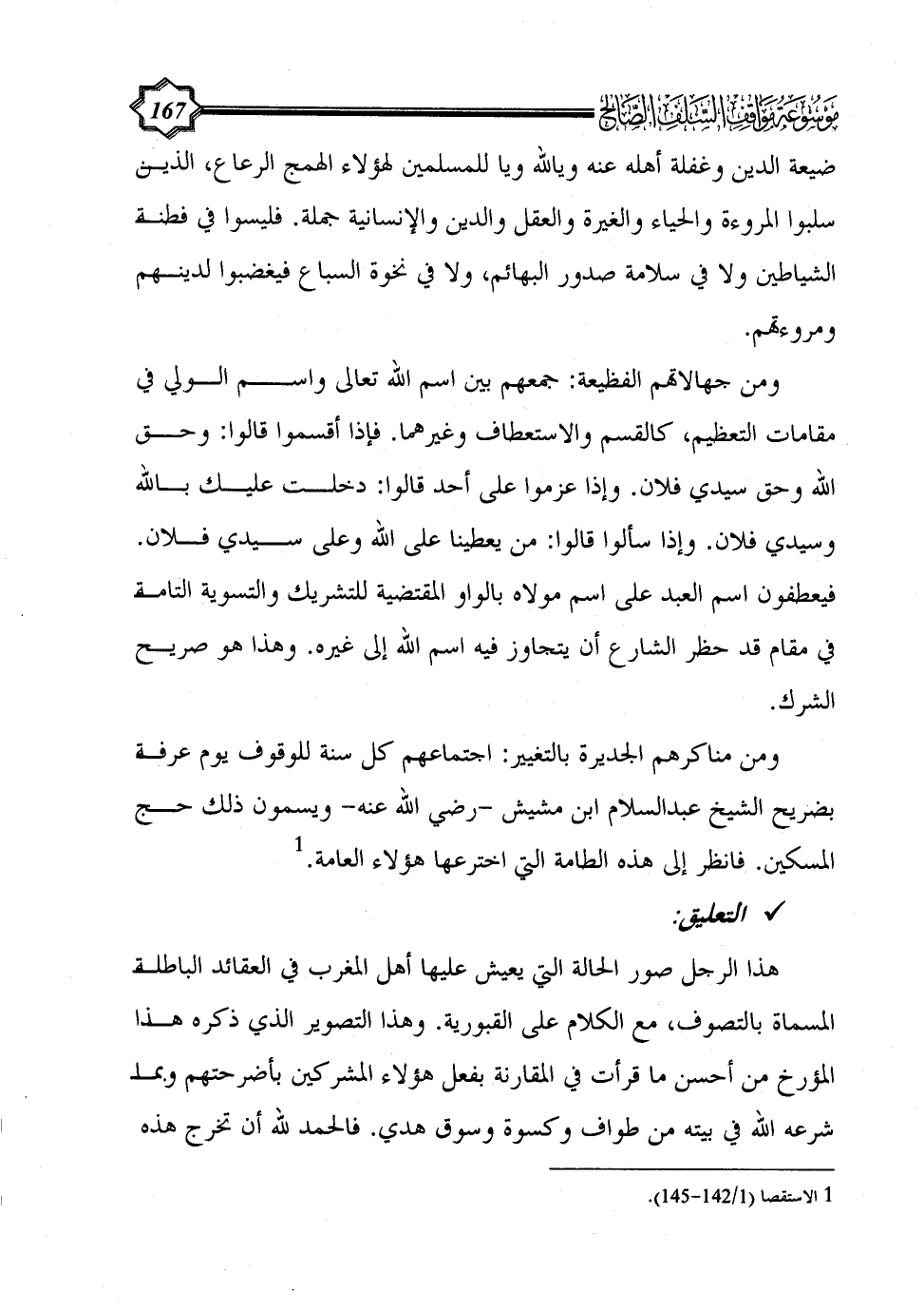 هذا الرجل صور الحالة التي يعيش عليها أهل المغرب في العقائد الباطلة المسماة بالتصوف، مع الكلام على القبورية. وهذا التصوير الذي ذكره هذا المؤرخ من أحسن ما قرأت في المقارنة بفعل هؤلاء المشركين بأضرحتهم وبما شرعه الله في بيته من طواف وكسوة وسوق هدي. فالحمد لله أن تخرج هذه