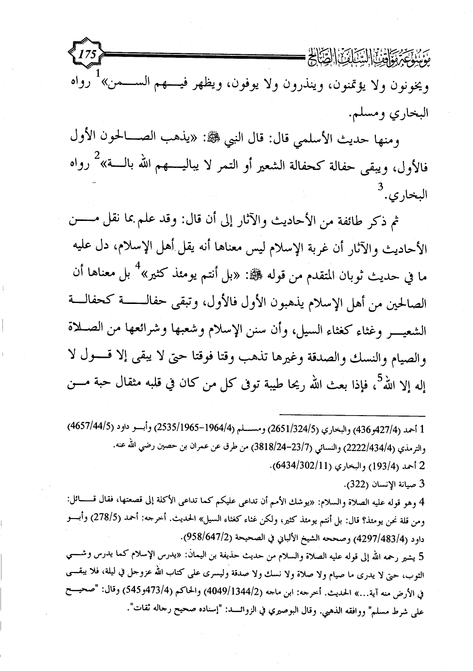 (¬5) يشير رحمه الله إلى قوله عليه الصلاة والسلام من حديث حذيفة بن اليمان: «يدرس الإسلام كما يدرس وشي الثوب، حتى لا يدرى ما صيام ولا صلاة ولا نسك ولا صدقة وليسرى على كتاب الله عزوجل في ليلة، فلا يبقى في الأرض منه آية ... » الحديث. أخرجه: ابن ماجه (2/ 1344/4049) والحاكم (4/ 473و545) وقال: "صحيح على شرط مسلم" ووافقه الذهبي. وقال البوصيري في الزوائد: "إسناده صحيح رجاله ثقات".