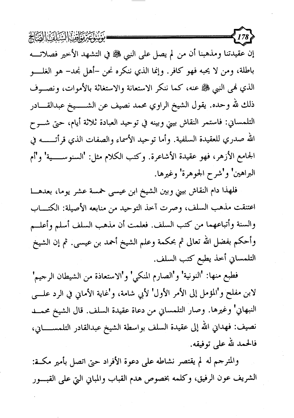 فلهذا دام النقاش بيني وبين الشيخ ابن عيسى خمسة عشر يوما، بعدها اعتنقت مذهب السلف، وصرت آخذ التوحيد من منابعه الأصيلة: الكتاب والسنة وأتباعهما من كتب السلف. فعلمت أن مذهب السلف أسلم وأعلم وأحكم بفضل الله تعالى ثم بحكمة وعلم الشيخ أحمد بن عيسى. ثم إن الشيخ التلمساني أخذ يطبع كتب السلف.