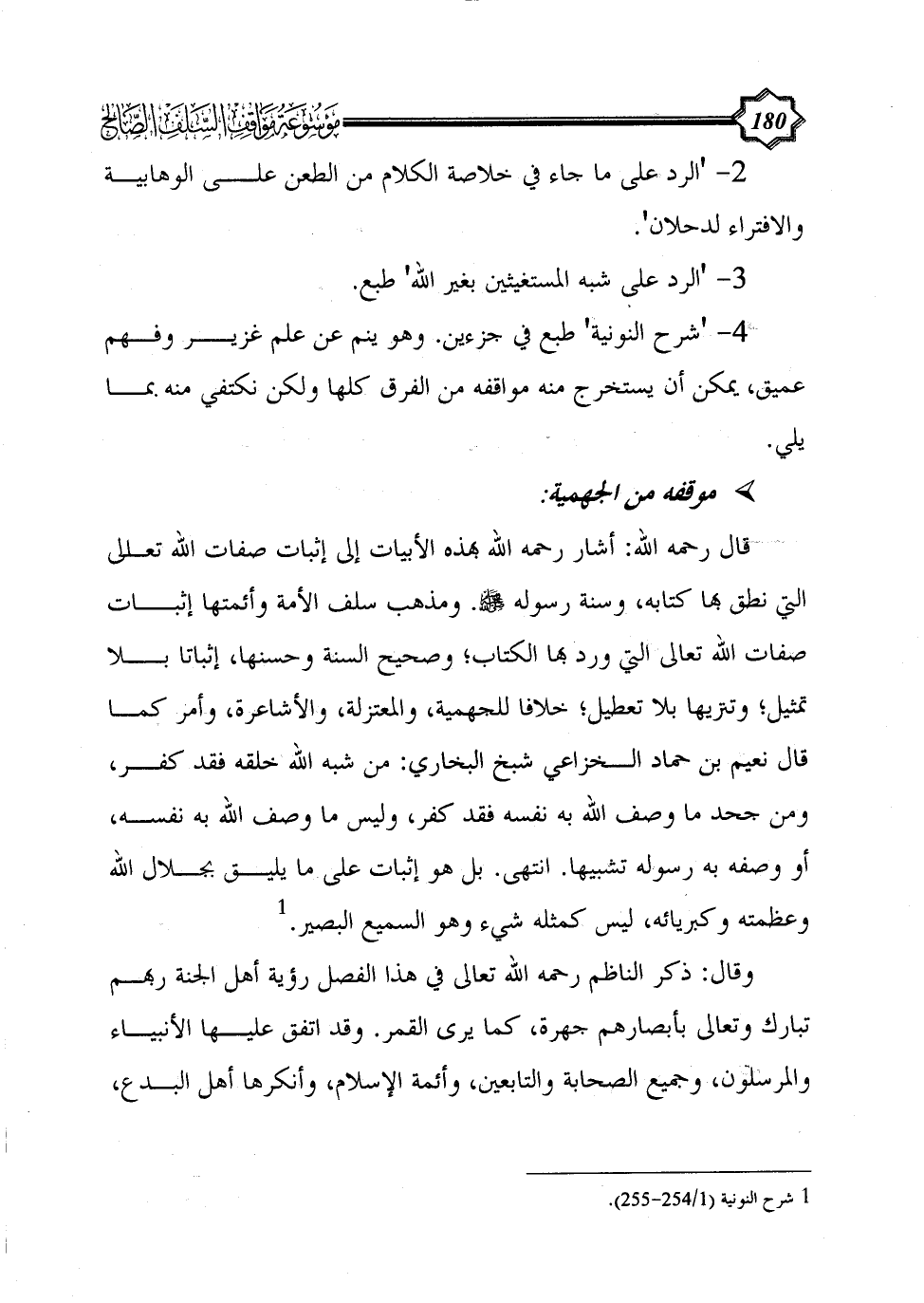 4 - 'شرح النونية' طبع في جزءين. وهو ينم عن علم غزير وفهم عميق، يمكن أن يستخرج منه مواقفه من الفرق كلها ولكن نكتفي منه بما يلي.