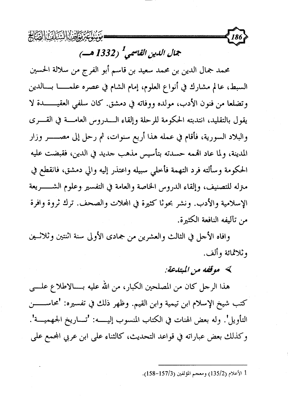 هذا الرجل كان من المصلحين الكبار، من الله عليه بالاطلاع على كتب شيخ الإسلام ابن تيمية وابن القيم. وظهر ذلك في تفسيره: 'محاسن التأويل'. وله بعض الهنات في الكتاب المنسوب إليه: 'تاريخ الجهمية'. وكذلك بعض عباراته في قواعد التحديث، كالثناء على ابن عربي المجمع على
