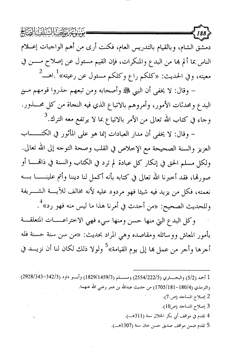 - وقال: لا يخفى أن مدار العبادات إنما هو على المأثور في الكتاب العزيز والسنة الصحيحة مع الإخلاص في القلب وصحة التوجه إلى الله تعالى. ولكل مسلم الحق في إنكار كل عبادة لم ترد في الكتاب والسنة في ذاتها أو صورتها، فقد أخبرنا الله تعالى في كتابه بأنه أكمل لنا ديننا وأتم علينا به نعمته، فكل من يزيد فيه شيئا فهو مردود عليه لأنه مخالف للآية الشريفة وللحديث الصحيح: «من أحدث في أمرنا هذا ما ليس منه فهو رد» (¬4).