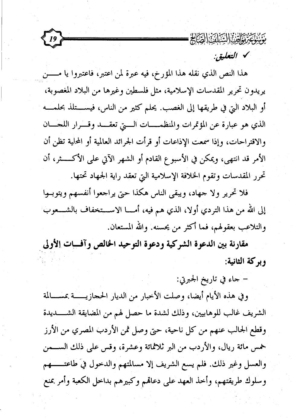 هذا النص الذي نقله هذا المؤرخ، فيه عبرة لمن اعتبر، فاعتبروا يا من يريدون تحرير المقدسات الإسلامية، مثل فلسطين وغيرها من البلاد المغصوبة، أو البلاد التي في طريقها إلى الغصب. يحلم كثير من الناس، فيستلذ بحلمه الذي هو عبارة عن المؤتمرات والمنظمات التي تعقد وقرار اللجان والاقتراحات، وإذا سمعت الإذاعات أو قرأت الجرائد العالمية أو المحلية تظن أن الأمر قد انتهى، ويمكن في الأسبوع القادم أو الشهر الآتي على الأكثر، أن تحرر المقدسات وتقوم الخلافة الإسلامية التي تعقد راية الجهاد تحتها.