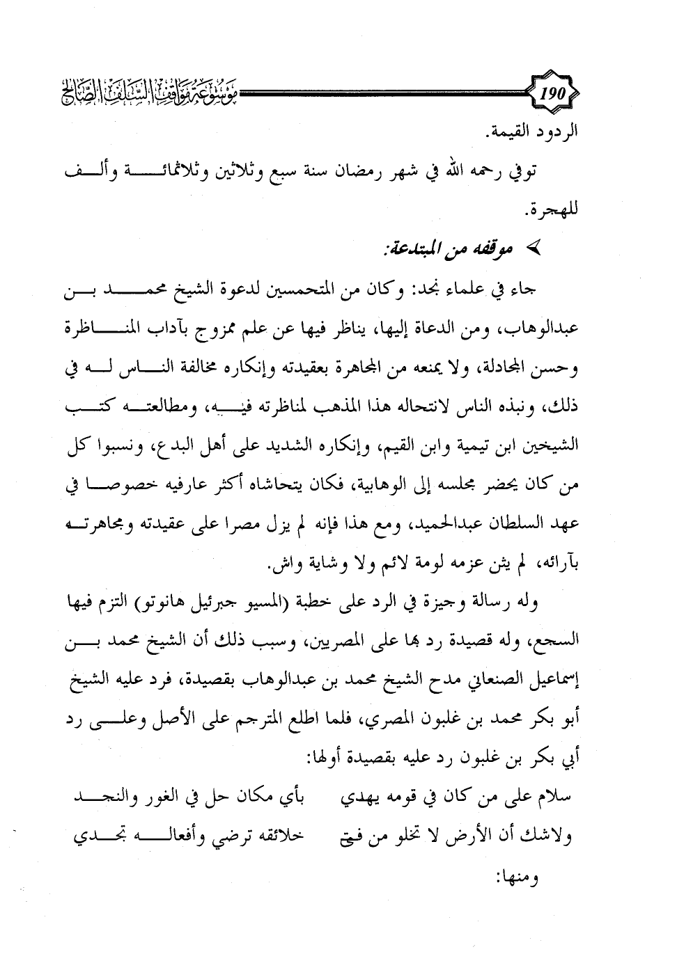 وله رسالة وجيزة في الرد على خطبة (المسيو جبرئيل هانوتو) التزم فيها السجع، وله قصيدة رد بها على المصريين، وسبب ذلك أن الشيخ محمد بن إسماعيل الصنعاني مدح الشيخ محمد بن عبد الوهاب بقصيدة، فرد عليه الشيخ أبو بكر محمد بن غلبون المصري، فلما اطلع المترجم على الأصل وعلى رد أبي بكر بن غلبون رد عليه بقصيدة أولها: