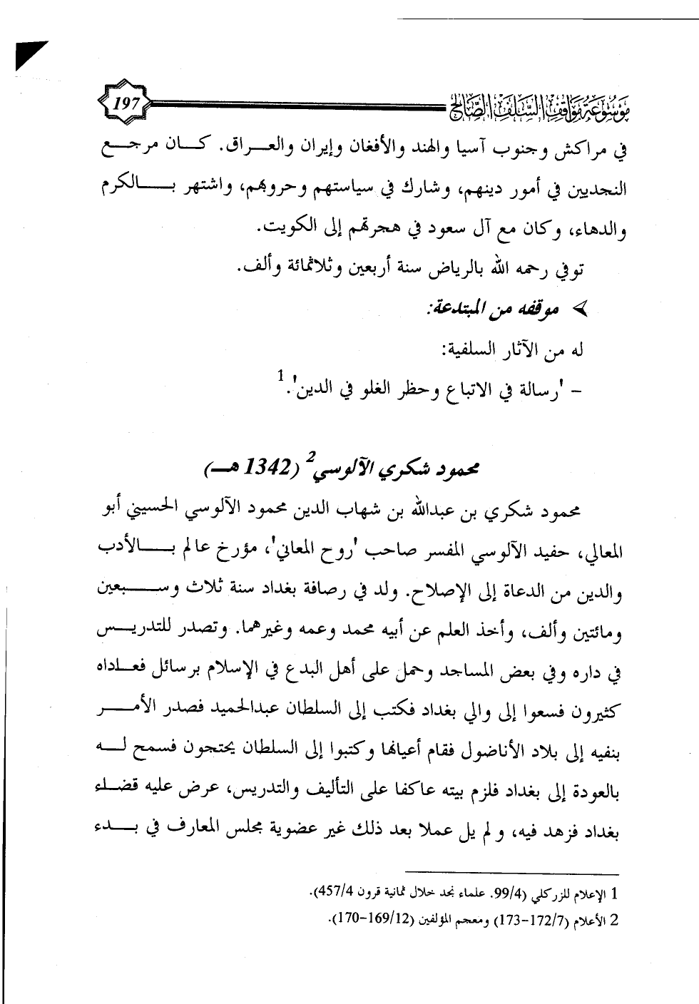 محمود شكري بن عبد الله بن شهاب الدين محمود الآلوسي الحسيني أبو المعالي، حفيد الآلوسي المفسر صاحب 'روح المعاني'، مؤرخ عالم بالأدب والدين من الدعاة إلى الإصلاح. ولد في رصافة بغداد سنة ثلاث وسبعين ومائتين وألف، وأخذ العلم عن أبيه محمد وعمه وغيرهما. وتصدر للتدريس في داره وفي بعض المساجد وحمل على أهل البدع في الإسلام برسائل فعاداه كثيرون فسعوا إلى والي بغداد فكتب إلى السلطان عبد الحميد فصدر الأمر بنفيه إلى بلاد الأناضول فقام أعيانها وكتبوا إلى السلطان يحتجون فسمح له بالعودة إلى بغداد فلزم بيته عاكفا على التأليف والتدريس، عرض عليه قضاء بغداد فزهد فيه، ولم يل عملا بعد ذلك غير عضوية مجلس المعارف في بدء