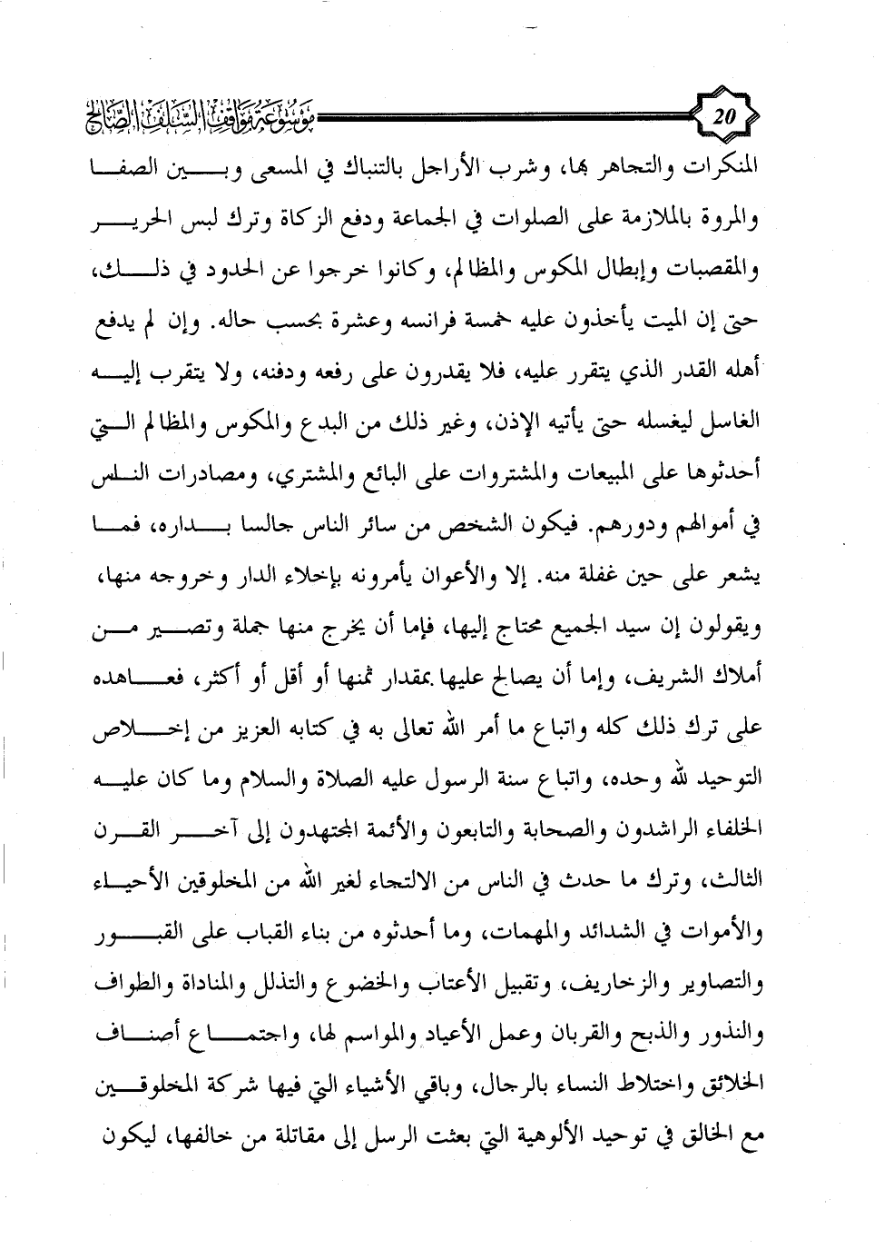 المنكرات والتجاهر بها، وشرب الأراجل بالتنباك في المسعى وبين الصفا والمروة بالملازمة على الصلوات في الجماعة ودفع الزكاة وترك لبس الحرير والمقصبات وإبطال المكوس والمظالم، وكانوا خرجوا عن الحدود في ذلك، حتى إن الميت يأخذون عليه خمسة فرانسه وعشرة بحسب حاله. وإن لم يدفع أهله القدر الذي يتقرر عليه، فلا يقدرون على رفعه ودفنه، ولا يتقرب إليه الغاسل ليغسله حتى يأتيه الإذن، وغير ذلك من البدع والمكوس والمظالم التي أحدثوها على المبيعات والمشتروات على البائع والمشتري، ومصادرات الناس في أموالهم ودورهم. فيكون الشخص من سائر الناس جالسا بداره، فما يشعر على حين غفلة منه.