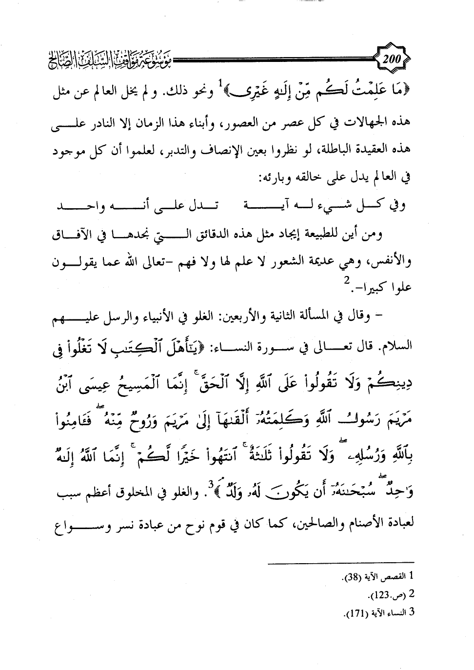 - وقال في المسألة الثانية والأربعين: الغلو في الأنبياء والرسل عليهم السلام. قال تعالى في سورة النساء: {يَا أَهْلَ الْكِتَابِ لَا تَغْلُوا فِي دِينِكُمْ وَلَا تَقُولُوا عَلَى اللَّهِ إِلَّا الْحَقَّ إِنَّمَا الْمَسِيحُ عِيسَى ابْنُ مَرْيَمَ رَسُولُ اللَّهِ وَكَلِمَتُهُ أَلْقَاهَا إِلَى مَرْيَمَ وَرُوحٌ مِنْهُ فَآَمِنُوا بِاللَّهِ وَرُسُلِهِ وَلَا تَقُولُوا ثَلَاثَةٌ انْتَهُوا خَيْرًا لَكُمْ إِنَّمَا اللَّهُ إِلَهٌ وَاحِدٌ سُبْحَانَهُ أَنْ يَكُونَ لَهُ وَلَدٌ} (¬3). والغلو في المخلوق أعظم سبب لعبادة الأصنام والصالحين، كما كان في قوم نوح من عبادة نسر وسواع