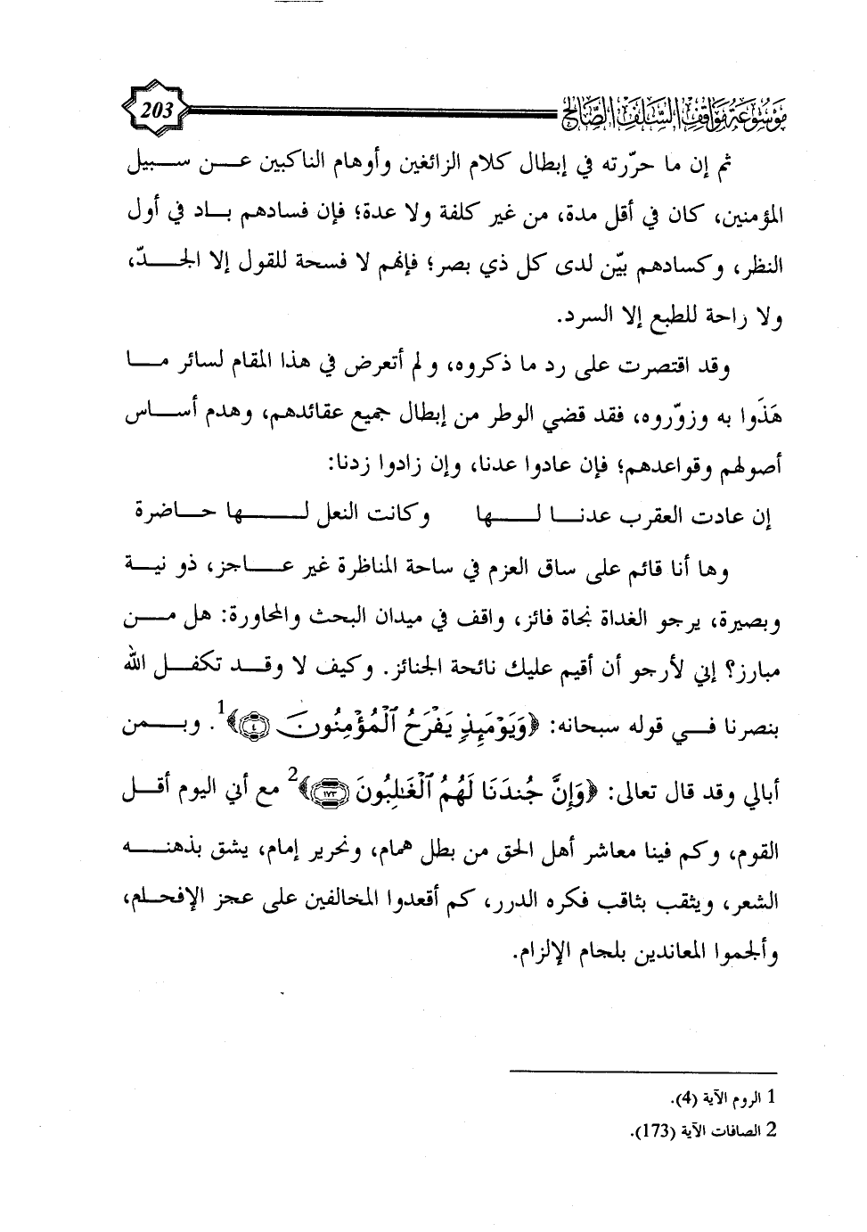 وها أنا قائم على ساق العزم في ساحة المناظرة غير عاجز، ذو نية وبصيرة، يرجو الغداة نجاة فائز، واقف في ميدان البحث والمحاورة: هل من مبارز؟ إني لأرجو أن أقيم عليك نائحة الجنائز. وكيف لا وقد تكفل الله بنصرنا في قوله سبحانه: {وَيَوْمَئِذٍ يَفْرَحُ الْمُؤْمِنُونَ (4)} (¬1). وبمن أبالي وقد قال تعالى: {وَإِنَّ جُنْدَنَا لَهُمُ الْغَالِبُونَ (173)} (¬2) مع أني اليوم أقل القوم، وكم فينا معاشر أهل الحق من بطل همام، ونحرير إمام، يشق بذهنه الشعر، ويثقب بثاقب فكره الدرر، كم أقعدوا المخالفين على عجز الإفحام، وألجموا المعاندين بلجام الإلزام.