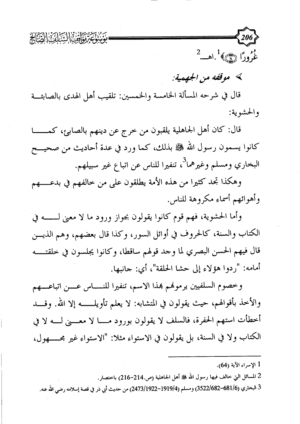 قال في شرحه المسألة الخامسة والخمسين: تلقيب أهل الهدى بالصابئة والحشوية: