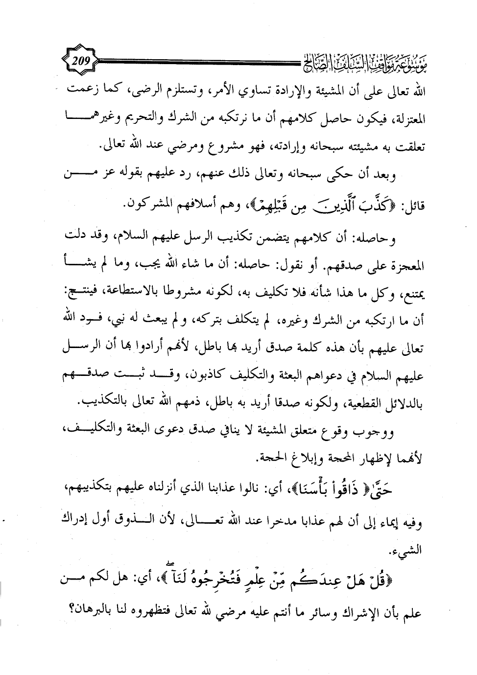 الله تعالى على أن المشيئة والإرادة تساوي الأمر، وتستلزم الرضى، كما زعمت المعتزلة، فيكون حاصل كلامهم أن ما نرتكبه من الشرك والتحريم وغيرهما تعلقت به مشيئته سبحانه وإرادته، فهو مشروع ومرضي عند الله تعالى.