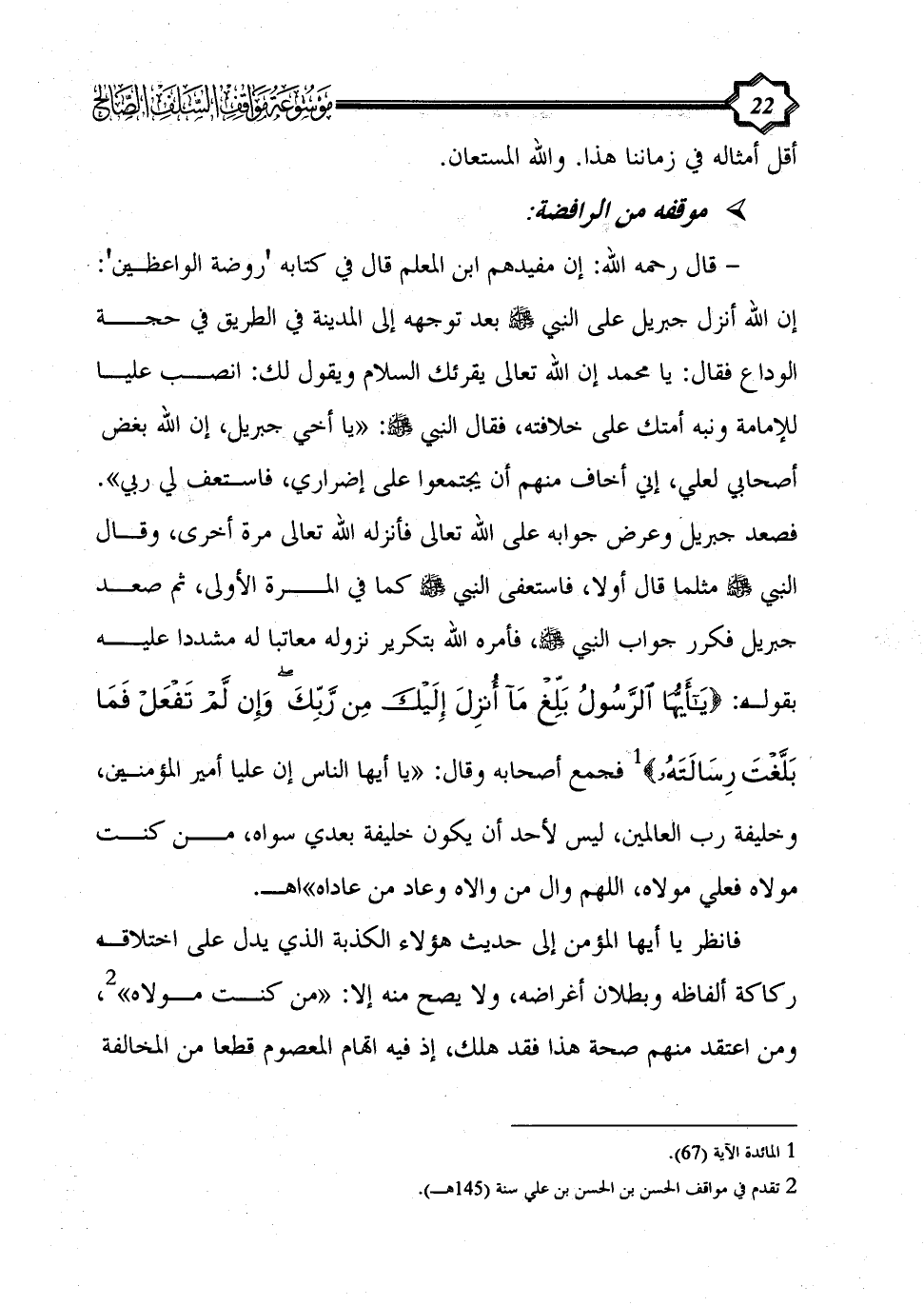 - قال رحمه الله: إن مفيدهم ابن المعلم قال في كتابه 'روضة الواعظين': إن الله أنزل جبريل على النبي - صلى الله عليه وسلم - بعد توجهه إلى المدينة في الطريق في حجة الوداع فقال: يا محمد إن الله تعالى يقرئك السلام ويقول لك: انصب عليا للإمامة ونبه أمتك على خلافته، فقال النبي - صلى الله عليه وسلم -: «يا أخي جبريل، إن الله بغض أصحابي لعلي، إني أخاف منهم أن يجتمعوا على إضراري، فاستعف لي ربي». فصعد جبريل وعرض جوابه على الله تعالى فأنزله الله تعالى مرة أخرى، وقال النبي - صلى الله عليه وسلم - مثلما قال أولا، فاستعفى النبي - صلى الله عليه وسلم - كما في المرة الأولى، ثم صعد جبريل فكرر جواب النبي - صلى الله عليه وسلم -، فأمره الله بتكرير نزوله معاتبا له مشددا عليه بقوله: {يَا أَيُّهَا الرَّسُولُ بَلِّغْ مَا أُنْزِلَ إِلَيْكَ مِنْ رَبِّكَ وَإِنْ لَمْ تَفْعَلْ فَمَا بَلَّغْتَ رِسَالَتَهُ} (¬1) فجمع أصحابه وقال: «يا أيها الناس إن عليا أمير المؤمنين، وخليفة رب العالمين، ليس لأحد أن يكون خليفة بعدي سواه، من كنت مولاه فعلي مولاه، اللهم وال من والاه وعاد من عاداه» اهـ.