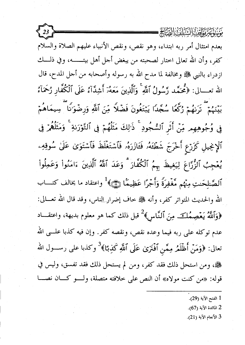 بعدم امتثال أمر ربه ابتداء، وهو نقص، ونقص الأنبياء عليهم الصلاة والسلام كفر، وأن الله تعالى اختار لصحبته من يبغض أجل أهل بيته، وفي ذلك ازدراء بالنبي - صلى الله عليه وسلم - ومخالفة لما مدح الله به رسوله وأصحابه من أجل المدح، قال الله تعالى: {محمد رَسُولُ اللَّهِ وَالَّذِينَ مَعَهُ أَشِدَّاءُ عَلَى الْكُفَّارِ رُحَمَاءُ بَيْنَهُمْ تَرَاهُمْ رُكَّعًا سُجَّدًا يَبْتَغُونَ فَضْلًا مِنَ اللَّهِ وَرِضْوَانًا سِيمَاهُمْ فِي وُجُوهِهِمْ مِنْ أَثَرِ السُّجُودِ ذَلِكَ مَثَلُهُمْ فِي التَّوْرَاةِ وَمَثَلُهُمْ فِي الْإِنْجِيلِ كَزَرْعٍ أَخْرَجَ شَطْأَهُ فَآَزَرَهُ فَاسْتَغْلَظَ فَاسْتَوَى عَلَى سُوقِهِ يُعْجِبُ الزُّرَّاعَ لِيَغِيظَ بِهِمُ الْكُفَّارَ وَعَدَ اللَّهُ الَّذِينَ آَمَنُوا وَعَمِلُوا الصَّالِحَاتِ مِنْهُمْ مَغْفِرَةً وَأَجْرًا عَظِيمًا (29)} (¬1) واعتقاد ما يخالف كتاب الله والحديث المتواتر كفر، وأنه - صلى الله عليه وسلم - خاف إضرار الناس، وقد قال الله تعالى: {وَاللَّهُ يَعْصِمُكَ مِنَ النَّاسِ} (¬2) قبل ذلك كما هو معلوم بديهة، واعتقاد عدم توكله على ربه فيما وعده نقص، ونقصه كفر. وإن فيه كذبا على الله تعالى: {وَمَنْ أَظْلَمُ مِمَّنِ افْتَرَى عَلَى اللَّهِ كَذِبًا} (¬3)