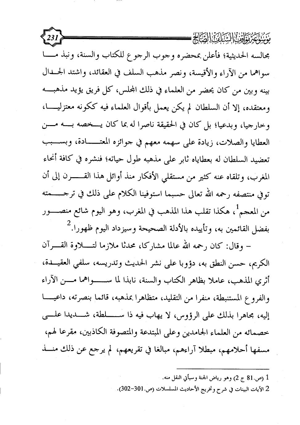 مجالسه الحديثية؛ فأعلن بمحضره وجوب الرجوع للكتاب والسنة، ونبذ ما سواهما من الآراء والأقيسة، ونصر مذهب السلف في العقائد، واشتد الجدال بينه وبين من كان يحضر من العلماء في ذلك المجلس، كل فريق يؤيد مذهبه ومعتقده، إلا أن السلطان لم يكن يعمل بأقوال العلماء فيه ككونه معتزليا، وخارجيا، وبدعيا؛ بل كان في الحقيقة ناصرا له بما كان يخصه به من العطايا والصلات، زيادة على سهمه معهم في جوائزه المعتادة، وبسبب تعضيد السلطان له بعطاياه ثابر على مذهبه طول حياته؛ فنشره في كافة أنحاء المغرب، وتلقاه عنه كثير من مستقلي الأفكار منذ أوائل هذا القرن إلى أن توفي منتصفه رحمه الله تعالى حسبما استوفينا الكلام على ذلك في ترجمته من المعجم (¬1)، هكذا تقلب هذا المذهب في المغرب، وهو اليوم شائع منصور بفضل القائمين به، وتأييده بالأدلة الصحيحة وسيزداد اليوم ظهورا. (¬2)