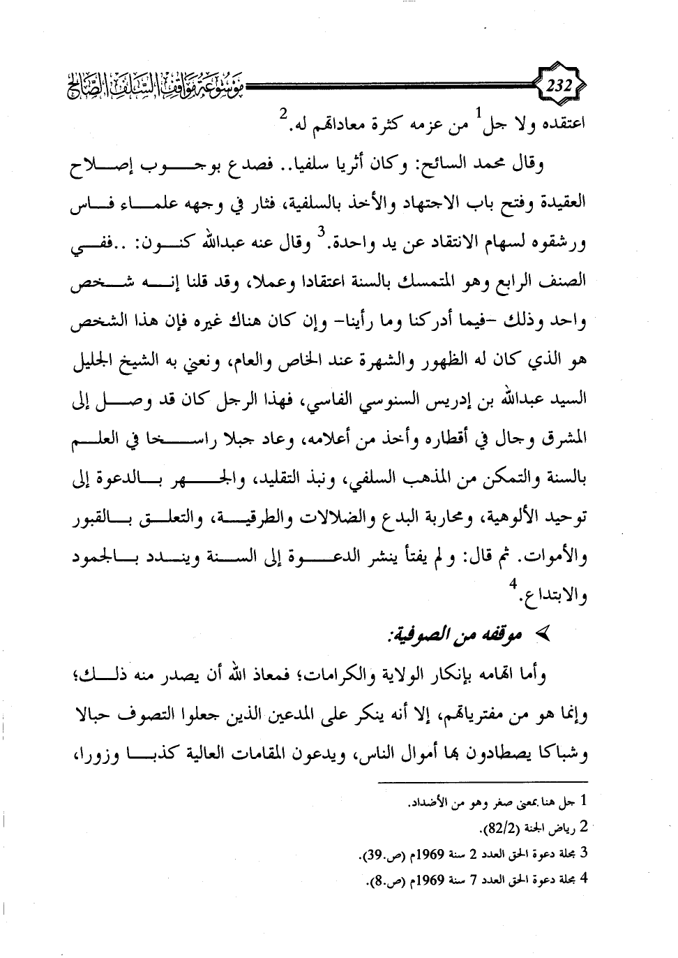 وقال محمد السائح: وكان أثريا سلفيا .. فصدع بوجوب إصلاح العقيدة وفتح باب الاجتهاد والأخذ بالسلفية، فثار في وجهه علماء فاس ورشقوه لسهام الانتقاد عن يد واحدة. (¬3) وقال عنه عبد الله كنون: .. ففي الصنف الرابع وهو المتمسك بالسنة اعتقادا وعملا، وقد قلنا إنه شخص واحد وذلك -فيما أدركنا وما رأينا- وإن كان هناك غيره فإن هذا الشخص هو الذي كان له الظهور والشهرة عند الخاص والعام، ونعني به الشيخ الجليل السيد عبد الله بن إدريس السنوسي الفاسي، فهذا الرجل كان قد وصل إلى المشرق وجال في أقطاره وأخذ من أعلامه، وعاد جبلا راسخا في العلم بالسنة والتمكن من المذهب السلفي، ونبذ التقليد، والجهر بالدعوة إلى توحيد الألوهية، ومحاربة البدع والضلالات والطرقية، والتعلق بالقبور والأموات. ثم قال: ولم يفتأ ينشر الدعوة إلى السنة ويندد بالجمود والابتداع. (¬4)