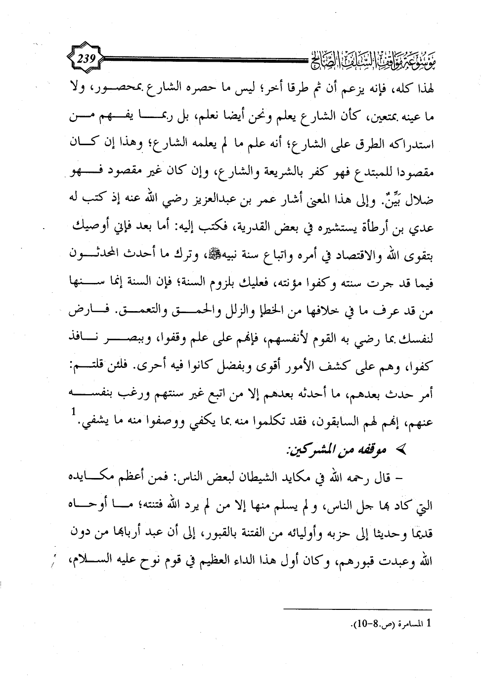 لهذا كله، فإنه يزعم أن ثم طرقا أخر؛ ليس ما حصره الشارع بمحصور، ولا ما عينه بمتعين، كأن الشارع يعلم ونحن أيضا نعلم، بل ربما يفهم من استدراكه الطرق على الشارع؛ أنه علم ما لم يعلمه الشارع؛ وهذا إن كان مقصودا للمبتدع فهو كفر بالشريعة والشارع، وإن كان غير مقصود فهو ضلال بَيِّنٌ. وإلى هذا المعنى أشار عمر بن عبد العزيز رضي الله عنه إذ كتب له عدي بن أرطأة يستشيره في بعض القدرية، فكتب إليه: أما بعد فإني أوصيك بتقوى الله والاقتصاد في أمره واتباع سنة نبيه - صلى الله عليه وسلم -، وترك ما أحدث المحدثون فيما قد جرت سنته وكفوا مؤنته، فعليك بلزوم السنة؛ فإن السنة إنما سنها من قد عرف ما في خلافها من الخطإ والزلل والحمق والتعمق. فارض لنفسك بما رضي به القوم لأنفسهم، فإنهم على علم وقفوا، وببصر نافذ كفوا، وهم على كشف الأمور أقوى وبفضل كانوا فيه أحرى. فلئن قلتم: أمر حدث بعدهم، ما أحدثه بعدهم إلا من اتبع غير سنتهم ورغب بنفسه عنهم، إنهم لهم السابقون، فقد تكلموا منه بما يكفي ووصفوا منه ما يشفي. (¬1)