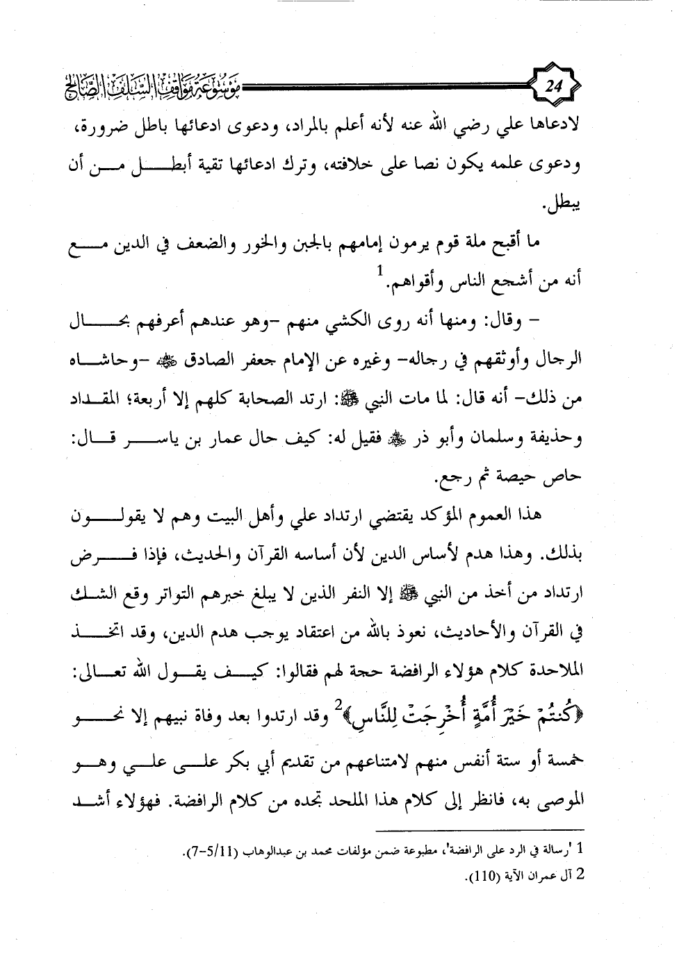 هذا العموم المؤكد يقتضي ارتداد علي وأهل البيت وهم لا يقولون بذلك. وهذا هدم لأساس الدين لأن أساسه القرآن والحديث، فإذا فرض ارتداد من أخذ من النبي - صلى الله عليه وسلم - إلا النفر الذين لا يبلغ خبرهم التواتر وقع الشك في القرآن والأحاديث، نعوذ بالله من اعتقاد يوجب هدم الدين، وقد اتخذ الملاحدة كلام هؤلاء الرافضة حجة لهم فقالوا: كيف يقول الله تعالى: {كُنْتُمْ خَيْرَ أُمَّةٍ أُخْرِجَتْ لِلنَّاسِ} (¬2) وقد ارتدوا بعد وفاة نبيهم إلا نحو خمسة أو ستة أنفس منهم لامتناعهم من تقديم أبي بكر على علي وهو الموصى به، فانظر إلى كلام هذا الملحد تجده من كلام الرافضة. فهؤلاء أشد