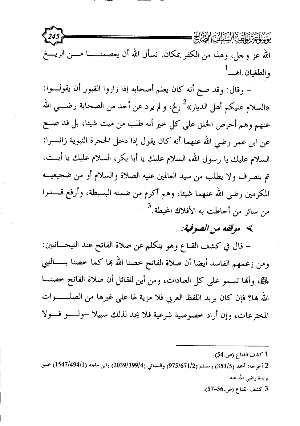 - قال في كشف القناع وهو يتكلم عن صلاة الفاتح عند التيجانيين: ومن زعمهم الفاسد أيضا أن صلاة الفاتح خصنا الله بها كما خصنا بالنبي - صلى الله عليه وسلم -، وأنها تسمو على كل العبادات، ومن أين للقائل أن صلاة الفاتح خصنا الله بها؟ فإن كان يريد اللفظ العربي فلا مزية لها على غيرها من الصلوات المخترعات، وإن أراد خصوصية شرعية فلا يجد لذلك سبيلا -ولو قولا