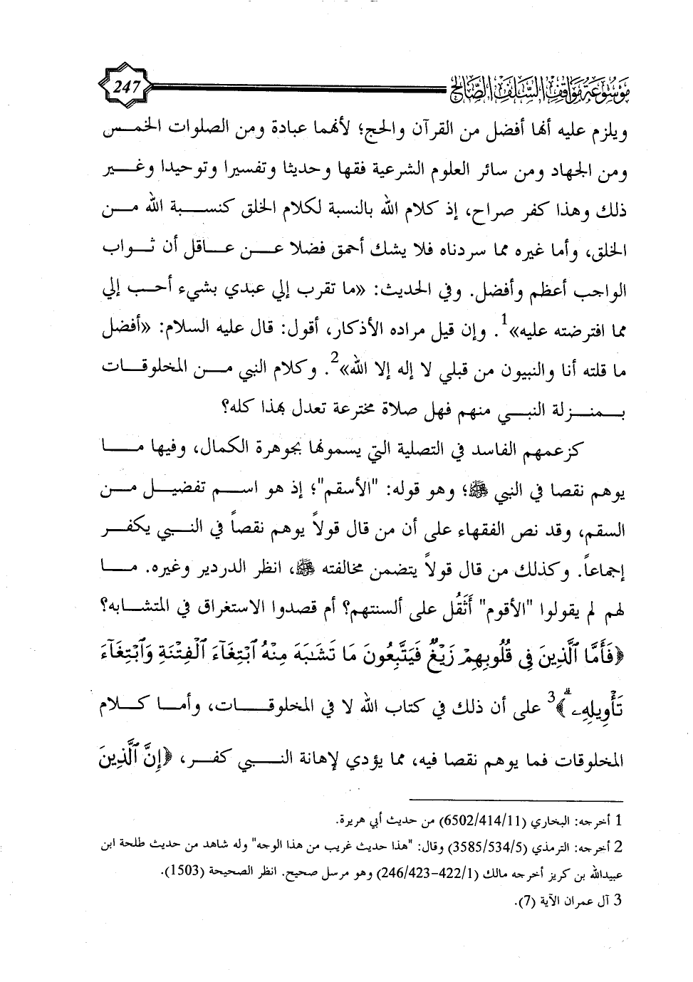 ويلزم عليه أنها أفضل من القرآن والحج؛ لأنهما عبادة ومن الصلوات الخمس ومن الجهاد ومن سائر العلوم الشرعية فقها وحديثا وتفسيرا وتوحيدا وغير ذلك وهذا كفر صراح، إذ كلام الله بالنسبة لكلام الخلق كنسبة الله من الخلق، وأما غيره مما سردناه فلا يشك أحمق فضلا عن عاقل أن ثواب الواجب أعظم وأفضل. وفي الحديث: «ما تقرب إلي عبدي بشيء أحب إلي مما افترضته عليه» (¬1). وإن قيل مراده الأذكار، أقول: قال عليه السلام: «أفضل ما قلته أنا والنبيون من قبلي لا إله إلا الله» (¬2). وكلام النبي من المخلوقات بمنزلة النبي منهم فهل صلاة مخترعة تعدل بهذا كله؟