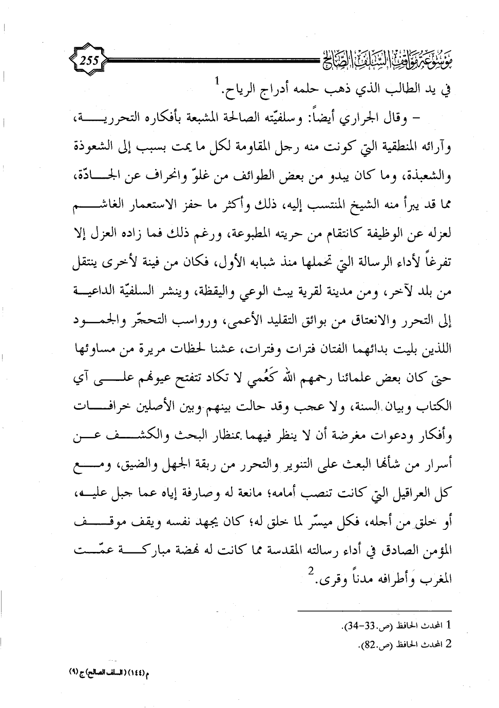 - وقال الجراري أيضاً: وسلفيّته الصالحة المشبعة بأفكاره التحررية، وآرائه المنطقية التي كونت منه رجل المقاومة لكل ما يمت بسبب إلى الشعوذة والشعبذة، وما كان يبدو من بعض الطوائف من غلوّ وانحراف عن الجادّة، مما قد يبرأ منه الشيخ المنتسب إليه، ذلك وأكثر ما حفز الاستعمار الغاشم لعزله عن الوظيفة كانتقام من حريته المطبوعة، ورغم ذلك فما زاده العزل إلا تفرغاً لأداء الرسالة التي تحملها منذ شبابه الأول، فكان من فينة لأخرى ينتقل من بلد لآخر، ومن مدينة لقرية يبث الوعي واليقظة، وينشر السلفيّة الداعية إلى التحرر والانعتاق من بوائق التقليد الأعمى، ورواسب التحجّر والجمود اللذين بليت بدائهما الفتان فترات وفترات، عشنا لحظات مريرة من مساوئها حتى كان بعض علمائنا رحمهم الله كَعُمي لا تكاد تتفتح عيونهم على آي الكتاب وبيان السنة، ولا عجب وقد حالت بينهم وبين الأصلين خرافات وأفكار ودعوات مغرضة أن لا ينظر فيهما بمنظار البحث والكشف عن أسرار من شأنها البعث على التنوير والتحرر من ربقة الجهل والضيق، ومع كل العراقيل التي كانت تنصب أمامه؛ مانعة له وصارفة إياه عما جبل عليه، أو خلق من أجله، فكل ميسّر لما خلق له؛ كان يجهد نفسه ويقف موقف المؤمن الصادق في أداء رسالته المقدسة مما كانت له نهضة مباركة عمّت المغرب وأطرافه مدناً وقرى. (¬2)