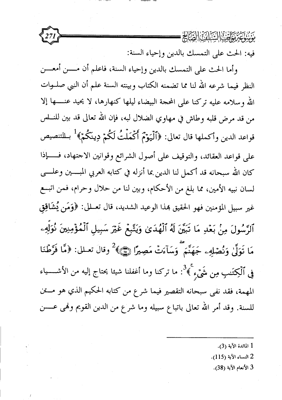 وأما الحث على التمسك بالدين وإحياء السنة، فاعلم أن من أمعن النظر فيما شرعه الله لنا مما تضمنه الكتاب وبينته السنة علم أن النبي صلوات الله وسلامه عليه تركنا على المحجة البيضاء ليلها كنهارها، لا يحيد عنها إلا من قد مرض قلبه وطاش في مهاوي الضلال لبه، فإن الله تعالى قد بين للناس قواعد الدين وأكملها قال تعالى: {اليوم أَكْمَلْتُ لَكُمْ دِينَكُمْ} (¬1) بالتنصيص على قواعد العقائد، والتوقيف على أصول الشرائع وقوانين الاجتهاد، فإذا كان الله سبحانه قد أكمل لنا الدين بما أنزله في كتابه العربي المبين وعلى لسان نبيه الأمين، مما بلغ من الأحكام، وبين لنا من حلال وحرام، فمن اتبع غير سبيل المؤمنين فهو الحقيق بهذا الوعيد الشديد، قال تعالى: {وَمَنْ يُشَاقِقِ الرَّسُولَ مِنْ بَعْدِ مَا تَبَيَّنَ لَهُ الْهُدَى وَيَتَّبِعْ غَيْرَ سَبِيلِ الْمُؤْمِنِينَ نُوَلِّهِ مَا تَوَلَّى وَنُصْلِهِ جَهَنَّمَ وَسَاءَتْ مَصِيرًا (115)} (¬2) وقال تعالى: {مَا فَرَّطْنَا فِي الْكِتَابِ مِنْ شَيْءٍ} (¬3): ما تركنا وما أغفلنا شيئا يحتاج إليه من الأشياء المهمة، فقد نفى سبحانه التقصير فيما شرع من كتابه الحكيم الذي هو متن للسنة. وقد أمر الله تعالى باتباع سبيله وما شرع من الدين القويم ونهى عن