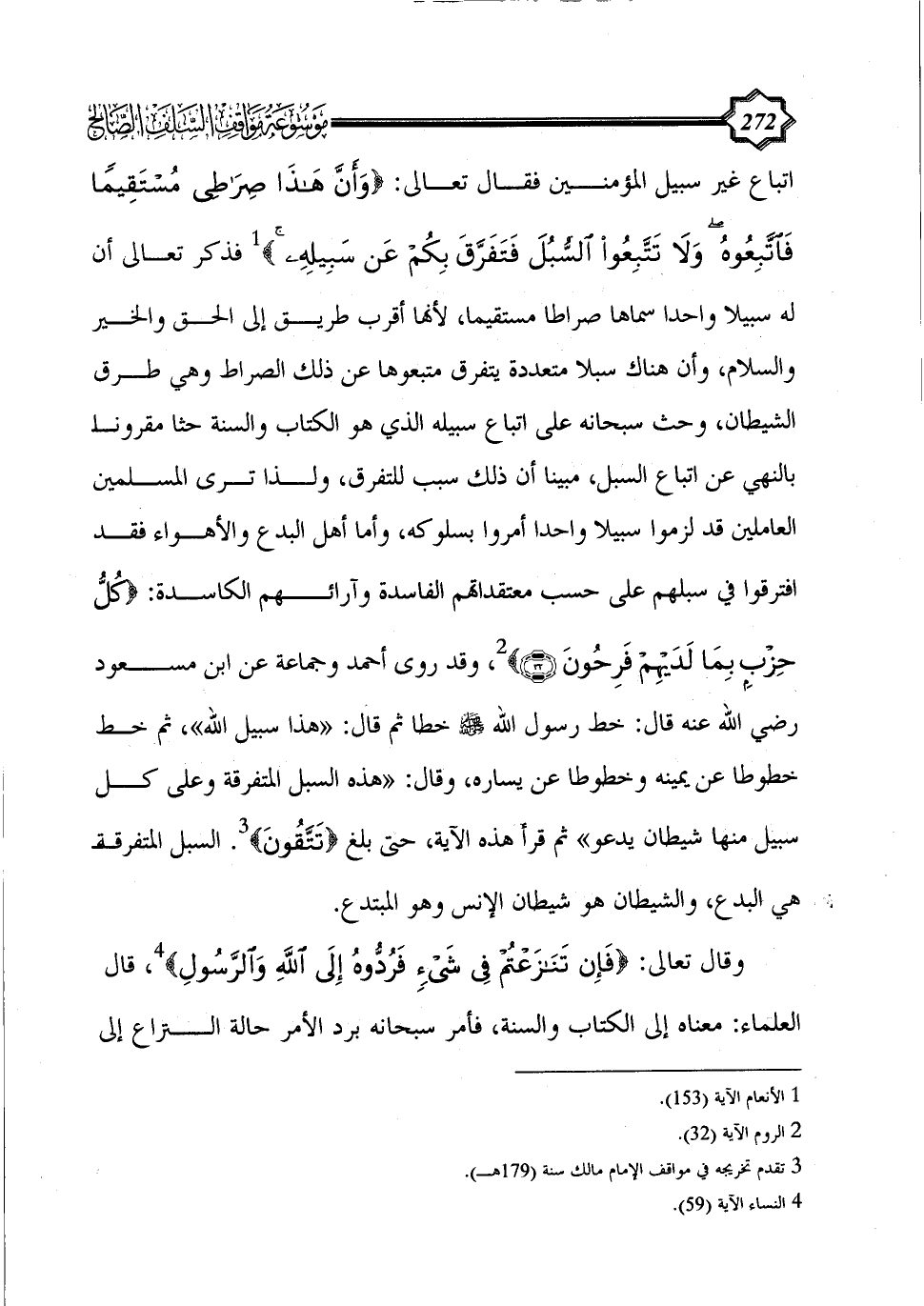 فذكر تعالى أن له سبيلا واحدا سماها صراطا مستقيما، لأنها أقرب طريق إلى الحق والخير والسلام، وأن هناك سبلا متعددة يتفرق متبعوها عن ذلك الصراط وهي طرق الشيطان، وحث سبحانه على اتباع سبيله الذي هو الكتاب والسنة حثا مقرونا بالنهي عن اتباع السبل، مبينا أن ذلك سبب للتفرق، ولذا ترى المسلمين العاملين قد لزموا سبيلا واحدا أمروا بسلوكه، وأما أهل البدع والأهواء فقد افترقوا في سبلهم على حسب معتقداتهم الفاسدة وآرائهم الكاسدة: {كُلُّ حِزْبٍ بِمَا لَدَيْهِمْ فَرِحُونَ (32)} (¬2)، وقد روى أحمد وجماعة عن ابن مسعود رضي الله عنه قال: خط رسول الله - صلى الله عليه وسلم - خطا ثم قال: «هذا سبيل الله»، ثم خط خطوطا عن يمينه وخطوطا عن يساره، وقال: «هذه السبل المتفرقة وعلى كل سبيل منها شيطان يدعو» ثم قرأ هذه الآية، حتى بلغ {تتقون} (¬3). السبل المتفرقة هي البدع، والشيطان هو شيطان الإنس وهو المبتدع.