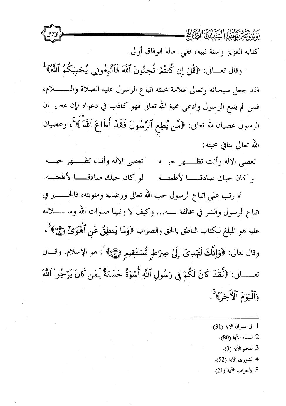 ثم رتب على اتباع الرسول حب الله تعالى ورضاءه ومثوبته، فالخير في اتباع الرسول والشر في مخالفة سننه ... وكيف لا ونبينا صلوات الله وسلامه عليه هو المبلغ للكتاب الناطق بالحق والصواب {وَمَا يَنْطِقُ عَنِ الْهَوَى (3)} (¬3)، وقال تعالى: {وَإِنَّكَ لَتَهْدِي إِلَى صِرَاطٍ مُسْتَقِيمٍ (52)} (¬4): هو الإسلام. وقال تعالى: {لَقَدْ كَانَ لَكُمْ فِي رَسُولِ اللَّهِ أُسْوَةٌ حَسَنَةٌ لِمَنْ كَانَ يَرْجُو اللَّهَ وَالْيَوْمَ الْآَخِرَ} (¬5).