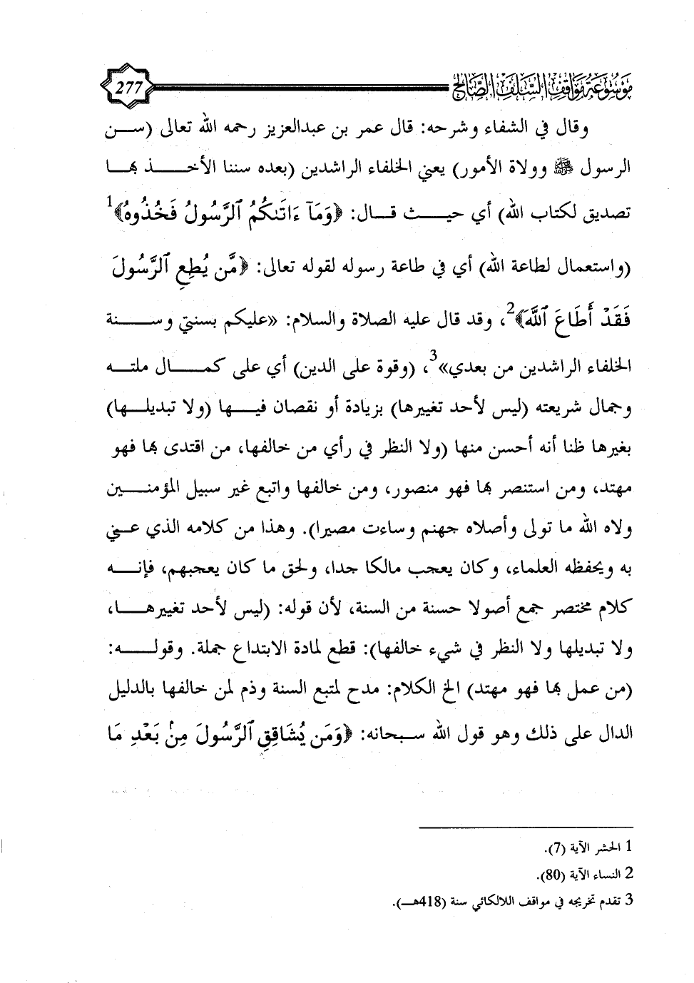 وقال في الشفاء وشرحه: قال عمر بن عبد العزيز رحمه الله تعالى (سن الرسول - صلى الله عليه وسلم - وولاة الأمور) يعني الخلفاء الراشدين (بعده سننا الأخذ بها تصديق لكتاب الله) أي حيث قال: {وما آَتَاكُمُ الرَّسُولُ فَخُذُوهُ} (¬1) (واستعمال لطاعة الله) أي في طاعة رسوله لقوله تعالى: {مَنْ يُطِعِ الرَّسُولَ فَقَدْ أَطَاعَ اللَّهَ} (¬2)، وقد قال عليه الصلاة والسلام: «عليكم بسنتي وسنة الخلفاء الراشدين من بعدي» (¬3)، (وقوة على الدين) أي على كمال ملته وجمال شريعته (ليس لأحد تغييرها) بزيادة أو نقصان فيها (ولا تبديلها) بغيرها ظنا أنه أحسن منها (ولا النظر في رأي من خالفها، من اقتدى بها فهو مهتد، ومن استنصر بها فهو منصور، ومن خالفها واتبع غير سبيل المؤمنين ولاه الله ما تولى وأصلاه جهنم وساءت مصيرا). وهذا من كلامه الذي عني به ويحفظه العلماء، وكان يعجب مالكا جدا، ولحق ما كان يعجبهم، فإنه كلام مختصر جمع أصولا حسنة من السنة، لأن قوله: (ليس لأحد تغييرها، ولا تبديلها ولا النظر في شيء خالفها): قطع لمادة الابتداع جملة. وقوله: (من عمل بها فهو مهتد) الخ الكلام: مدح لمتبع السنة وذم لمن خالفها بالدليل الدال على ذلك وهو قول الله سبحانه: {وَمَنْ يُشَاقِقِ الرَّسُولَ مِنْ بَعْدِ مَا