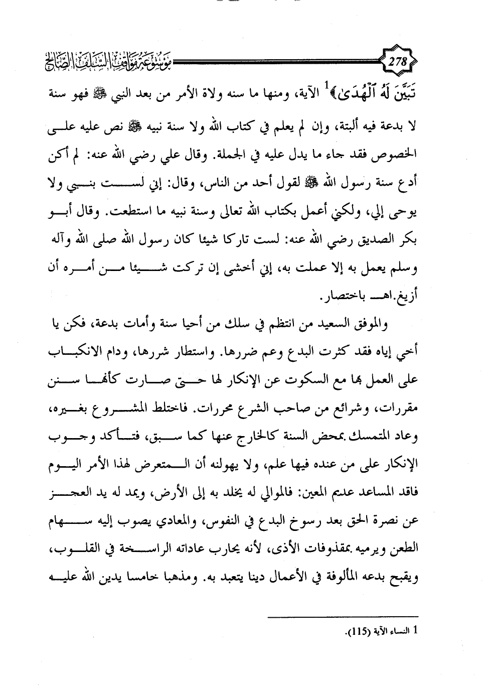 تَبَيَّنَ لَهُ الْهُدَى} (¬1) الآية، ومنها ما سنه ولاة الأمر من بعد النبي - صلى الله عليه وسلم - فهو سنة لا بدعة فيه ألبتة، وإن لم يعلم في كتاب الله ولا سنة نبيه - صلى الله عليه وسلم - نص عليه على الخصوص فقد جاء ما يدل عليه في الجملة. وقال علي رضي الله عنه: لم أكن أدع سنة رسول الله - صلى الله عليه وسلم - لقول أحد من الناس، وقال: إني لست بنبي ولا يوحى إلي، ولكني أعمل بكتاب الله تعالى وسنة نبيه ما استطعت.