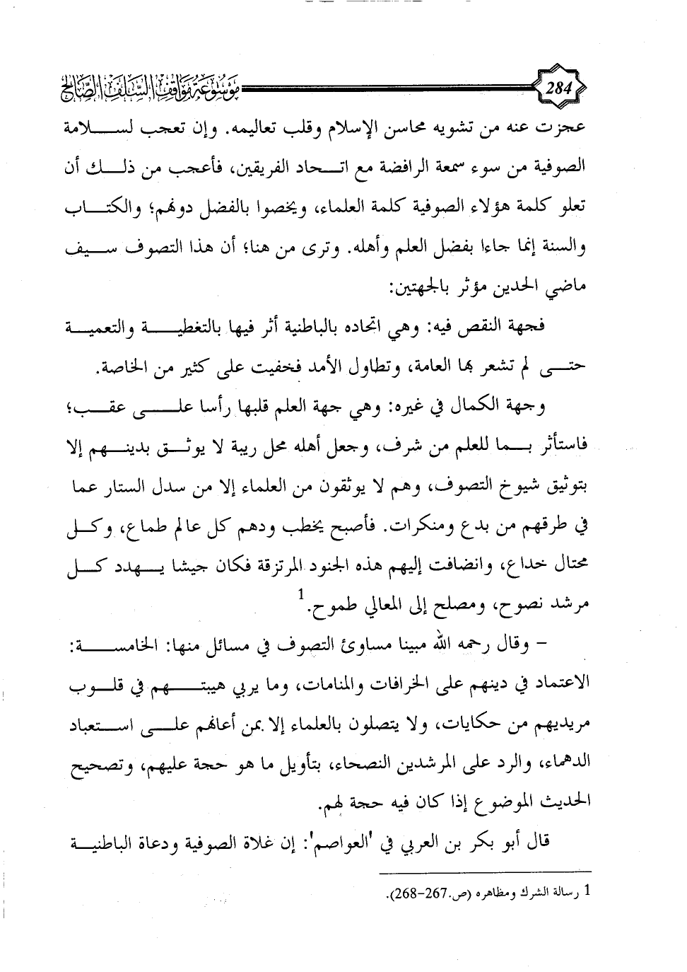 عجزت عنه من تشويه محاسن الإسلام وقلب تعاليمه. وإن تعجب لسلامة الصوفية من سوء سمعة الرافضة مع اتحاد الفريقين، فأعجب من ذلك أن تعلو كلمة هؤلاء الصوفية كلمة العلماء، ويخصّوا بالفضل دونهم؛ والكتاب والسنة إنما جاءا بفضل العلم وأهله. وترى من هنا؛ أن هذا التصوف سيف ماضي الحدين مؤثر بالجهتين: