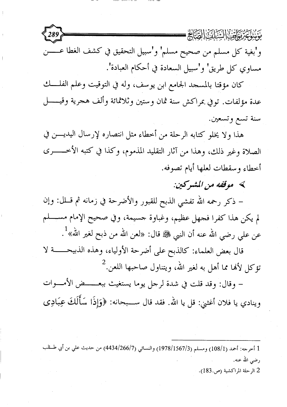 - ذكر رحمه الله تفشي الذبح للقبور والأضرحة في زمانه ثم قال: وإن لم يكن هذا كفرا فجهل عظيم، وغباوة جسيمة، وفي صحيح الإمام مسلم عن علي رضي الله عنه أن النبي - صلى الله عليه وسلم - قال: «لعن الله من ذبح لغير الله» (¬1).