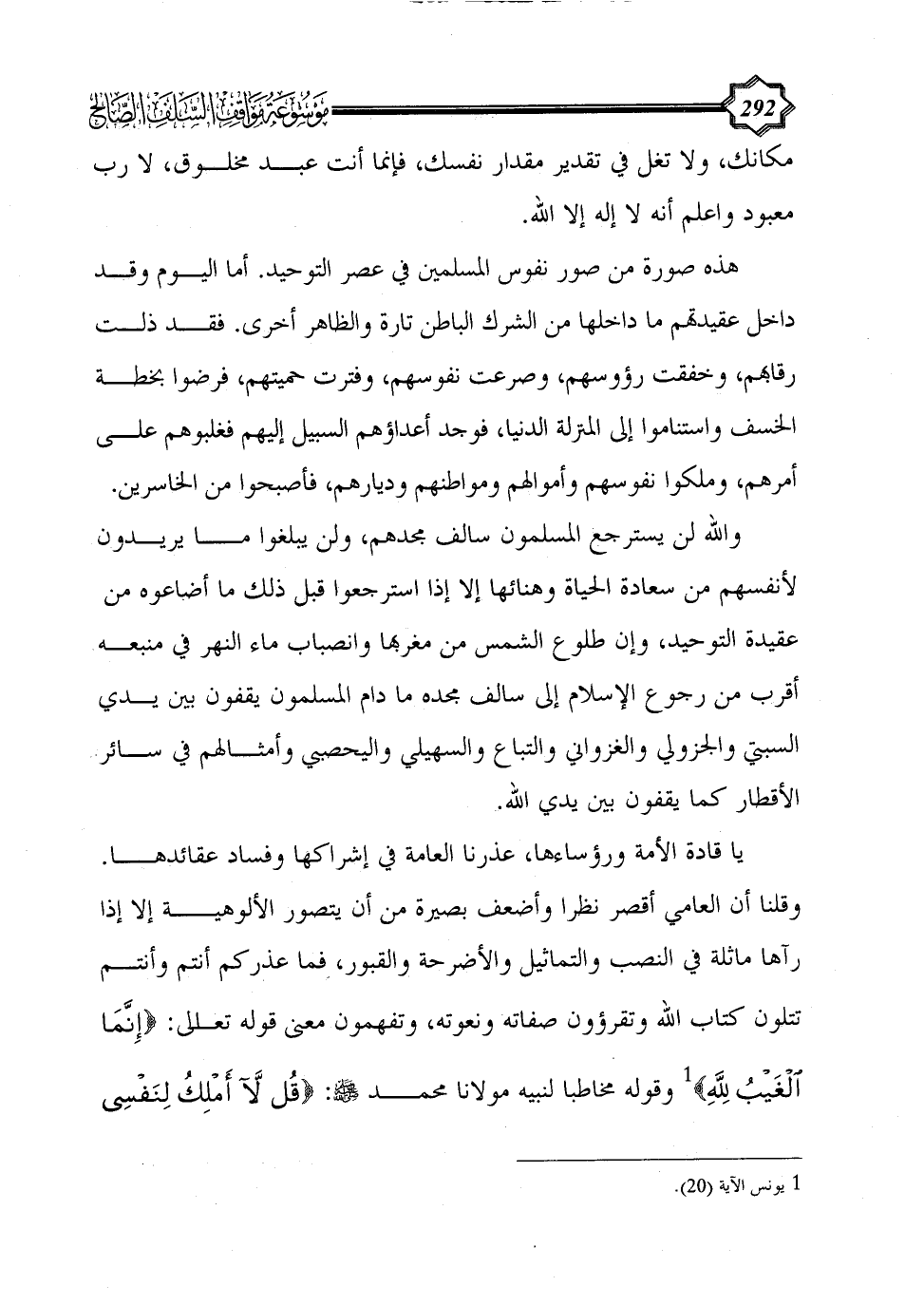 والله لن يسترجع المسلمون سالف مجدهم، ولن يبلغوا ما يريدون لأنفسهم من سعادة الحياة وهنائها إلا إذا استرجعوا قبل ذلك ما أضاعوه من عقيدة التوحيد، وإن طلوع الشمس من مغربها وانصباب ماء النهر في منبعه أقرب من رجوع الإسلام إلى سالف مجده ما دام المسلمون يقفون بين يدي السبتي والجزولي والغزواني والتباع والسهيلي واليحصبي وأمثالهم في سائر الأقطار كما يقفون بين يدي الله.