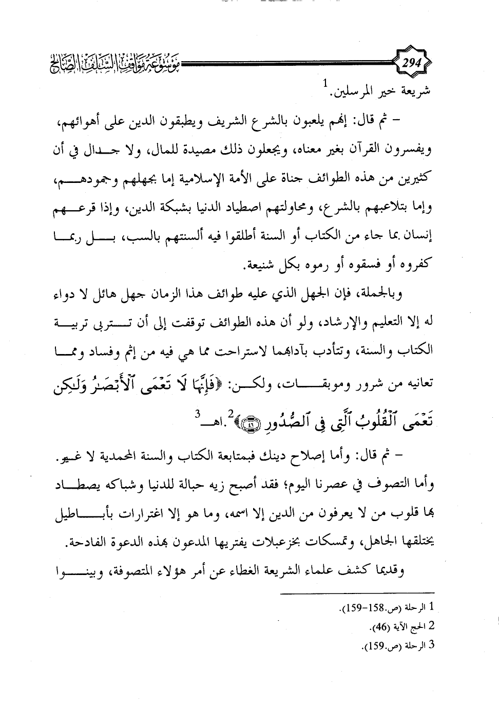 وبالجملة، فإن الجهل الذي عليه طوائف هذا الزمان جهل هائل لا دواء له إلا التعليم والإرشاد، ولو أن هذه الطوائف توقفت إلى أن تتربى تربية الكتاب والسنة، وتتأدب بآدابهما لاستراحت مما هي فيه من إثم وفساد ومما تعانيه من شرور وموبقات، ولكن: {فَإِنَّهَا لَا تَعْمَى الْأَبْصَارُ وَلَكِنْ تَعْمَى الْقُلُوبُ الَّتِي فِي الصُّدُورِ (46)} (¬2).اهـ (¬3)