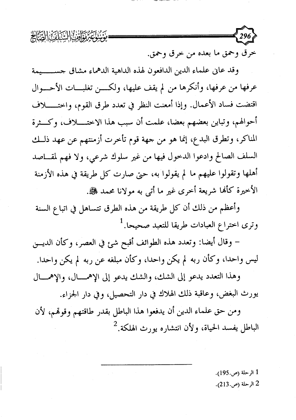 وقد عانى علماء الدين الدافعون لهذه الداهية الدهماء مشاق جسيمة عرفها من عرفها، وأنكرها من لم يقف عليها، ولكن تغلبات الأحوال اقتضت فساد الأعمال. وإذا أمعنت النظر في تعدد طرق القوم، واختلاف أحوالهم، وتباين بعضهم بعضا، علمت أن سبب هذا الاختلاف، وكثرة المناكر، وتطرق البدع، إنما هو من جهة قوم تأخرت أزمنتهم عن عهد ذلك السلف الصالح وادعوا الدخول فيها من غير سلوك شرعي، ولا فهم لمقاصد أهلها وتقولوا عليهم ما لم يقولوا به، حتى صارت كل طريقة في هذه الأزمنة الأخيرة كأنها شريعة أخرى غير ما أتى به مولانا محمد - صلى الله عليه وسلم -.