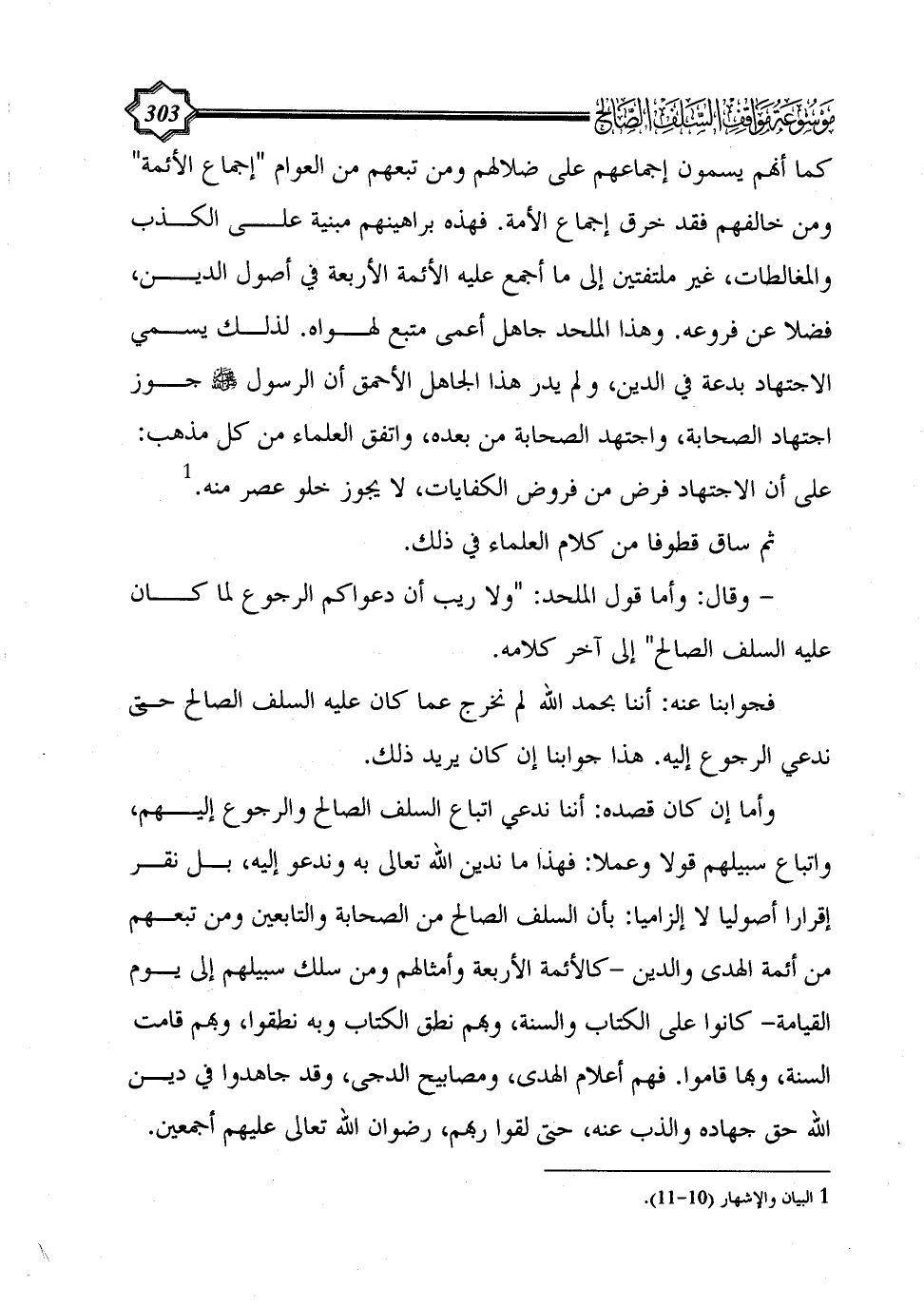 كما أنهم يسمون إجماعهم على ضلالهم ومن تبعهم من العوام "إجماع الأئمة" ومن خالفهم فقد خرق إجماع الأمة. فهذه براهينهم مبنية على الكذب والمغالطات، غير ملتفتين إلى ما أجمع عليه الأئمة الأربعة في أصول الدين، فضلا عن فروعه. وهذا الملحد جاهل أعمى متبع لهواه. لذلك يسمي الاجتهاد بدعة في الدين، ولم يدر هذا الجاهل الأحمق أن الرسول - صلى الله عليه وسلم - جوز اجتهاد الصحابة، واجتهد الصحابة من بعده، واتفق العلماء من كل مذهب: على أن الاجتهاد فرض من فروض الكفايات، لا يجوز خلو عصر منه. (¬1)