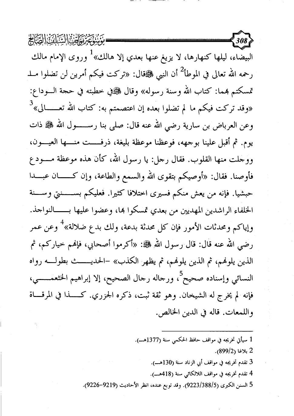 البيضاء، ليلها كنهارها، لا يزيغ عنها بعدي إلا هالك» (¬1) وروى الإمام مالك رحمه الله تعالى في الموطأ (¬2) أن النبي - صلى الله عليه وسلم - قال: «تركت فيكم أمرين لن تضلوا ما تمسكتم بهما: كتاب الله وسنة رسوله» وقال - صلى الله عليه وسلم - في خطبته في حجة الوداع: «وقد تركت فيكم ما لم تضلوا بعده إن اعتصمتم به: كتاب الله تعالى» (¬3) وعن العرباض بن سارية رضي الله عنه قال: صلى بنا رسول الله - صلى الله عليه وسلم - ذات يوم. ثم أقبل علينا بوجهه، فوعظنا موعظة بليغة، ذرفت منها العيون، ووجلت منها القلوب. فقال رجل: يا رسول الله، كأن هذه موعظة مودع فأوصنا. فقال: «أوصيكم بتقوى الله والسمع والطاعة، وإن كان عبداً حبشياً. فإنه من يعش منكم فسيرى اختلافاً كثيراً. فعليكم بسنتي وسنة الخلفاء الراشدين المهديين من بعدي تمسكوا بها، وعضوا عليها بالنواجذ. وإياكم ومحدثات الأمور فإن كل محدثة بدعة، ولك بدع ضلالة» (¬4) وعن عمر رضي الله عنه قال: قال رسول الله - صلى الله عليه وسلم -: «أكرموا أصحابي، فإنهم خياركم، ثم الذين يلونهم، ثم الذين يلونهم، ثم يظهر الكذب» -الحديث بطوله رواه النسائي وإسناده صحيح (¬5)،