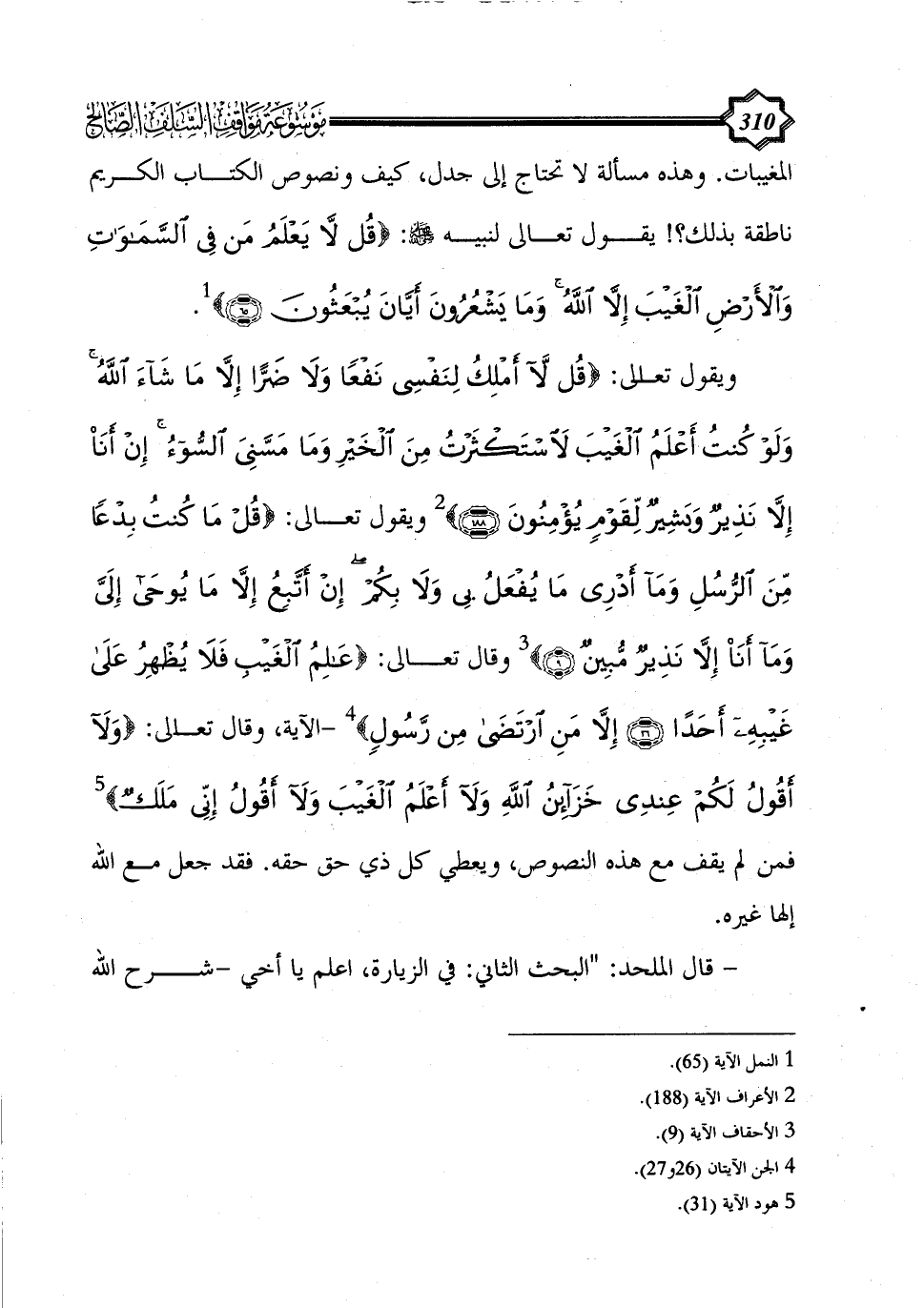 المغيبات. وهذه مسألة لا تحتاج إلى جدل، كيف ونصوص الكتاب الكريم ناطقة بذلك؟! يقول تعالى لنبيه - صلى الله عليه وسلم -: {قُلْ لَا يَعْلَمُ مَنْ فِي السَّمَاوَاتِ وَالْأَرْضِ الْغَيْبَ إِلَّا اللَّهُ وَمَا يَشْعُرُونَ أَيَّانَ يُبْعَثُونَ (65)} (¬1).