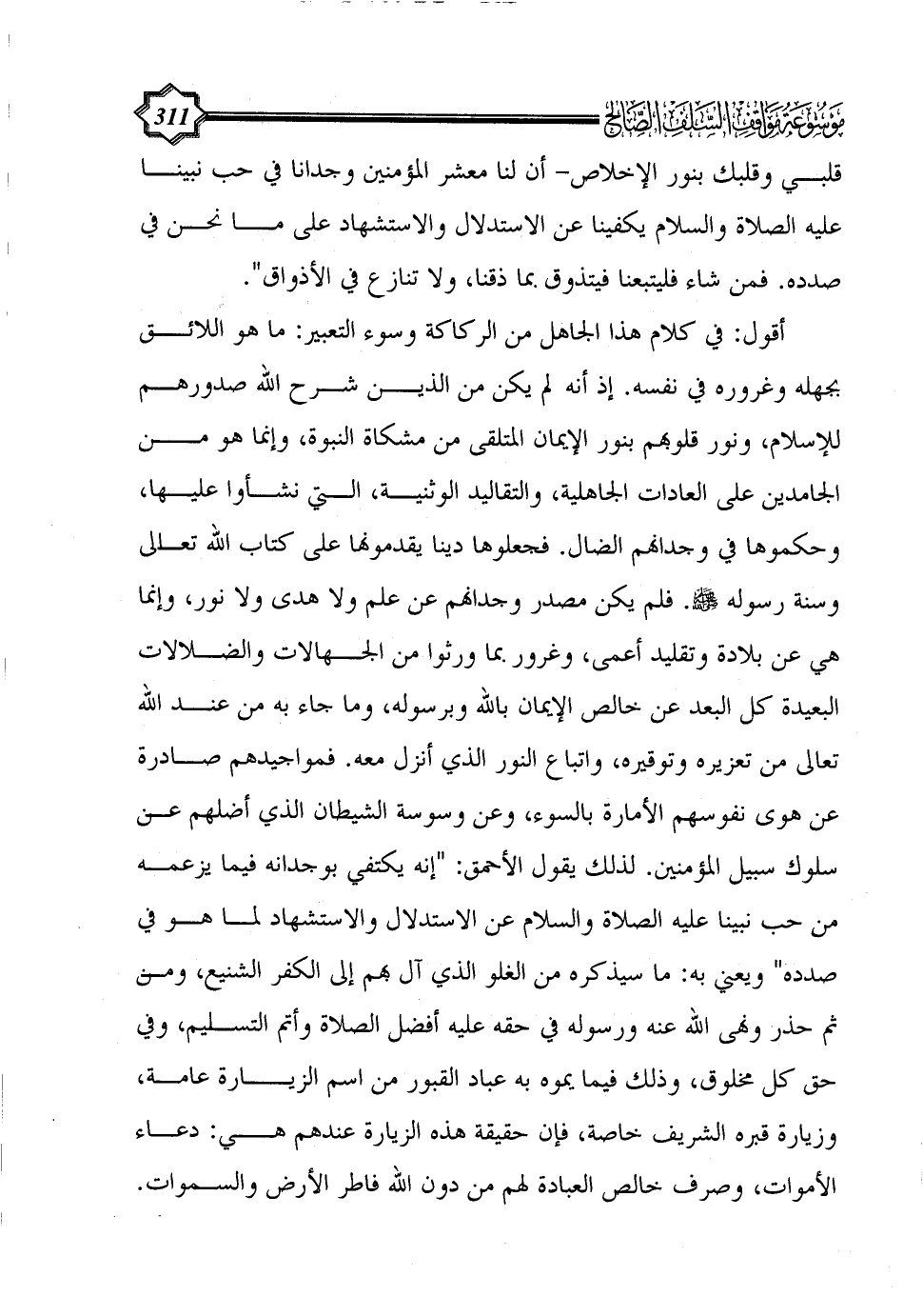 أقول: في كلام هذا الجاهل من الركاكة وسوء التعبير: ما هو اللائق بجهله وغروره في نفسه. إذ أنه لم يكن من الذين شرح الله صدورهم للإسلام، ونور قلوبهم بنور الإيمان المتلقى من مشكاة النبوة، وإنما هو من الجامدين على العادات الجاهلية، والتقاليد الوثنية، التي نشأوا عليها، وحكموها في وجدانهم الضال. فجعلوها دينا يقدمونها على كتاب الله تعالى وسنة رسوله - صلى الله عليه وسلم -. فلم يكن مصدر وجدانهم عن علم ولا هدى ولا نور، وإنما هي عن بلادة وتقليد أعمى، وغرور بما ورثوا من الجهالات والضلالات البعيدة كل البعد عن خالص الإيمان بالله وبرسوله، وما جاء به من عند الله تعالى من تعزيره وتوقيره، واتباع النور الذي أنزل معه. فمواجيدهم صادرة عن هوى نفوسهم الأمارة بالسوء، وعن وسوسة الشيطان الذي أضلهم عن سلوك سبيل المؤمنين. لذلك يقول الأحمق: "إنه يكتفي بوجدانه فيما يزعمه من حب نبينا عليه الصلاة والسلام عن الاستدلال والاستشهاد لما هو في صدده" ويعني به: ما سيذكره من الغلو الذي آل بهم إلى الكفر الشنيع، ومن ثم حذر ونهى الله عنه ورسوله في حقه عليه أفضل الصلاة وأتم التسليم، وفي حق كل مخلوق، وذلك فيما يموه به عباد القبور من اسم الزيارة عامة، وزيارة قبره الشريف خاصة، فإن حقيقة هذه الزيارة عندهم هي: دعاء الأموات، وصرف خالص العبادة لهم من دون الله فاطر الأرض والسموات.