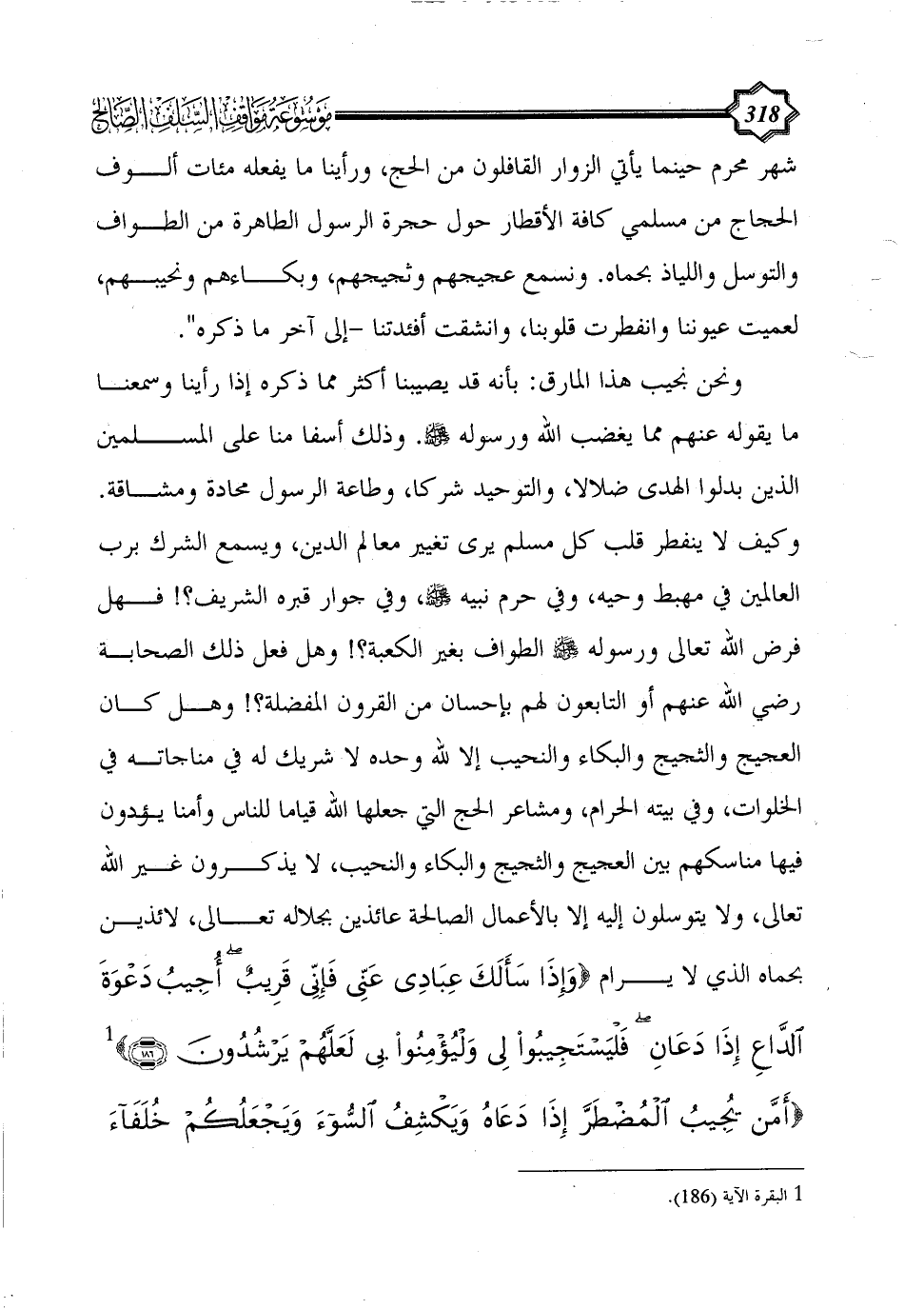 ونحن نجيب هذا المارق: بأنه قد يصيبنا أكثر مما ذكره إذا رأينا وسمعنا ما يقوله عنهم مما يغضب الله ورسوله - صلى الله عليه وسلم -. وذلك أسفا منا على المسلمين الذين بدلوا الهدى ضلالا، والتوحيد شركا، وطاعة الرسول محادة ومشاقة. وكيف لا ينفطر قلب كل مسلم يرى تغيير معالم الدين، ويسمع الشرك برب العالمين في مهبط وحيه، وفي حرم نبيه - صلى الله عليه وسلم -، وفي جوار قبره الشريف؟! فهل فرض الله تعالى ورسوله - صلى الله عليه وسلم - الطواف بغير الكعبة؟! وهل فعل ذلك الصحابة رضي الله عنهم أو التابعون لهم بإحسان من القرون المفضلة؟! وهل كان العجيج والثجيج والبكاء والنحيب إلا لله وحده لا شريك له في مناجاته في الخلوات، وفي بيته الحرام، ومشاعر الحج التي جعلها الله قياما للناس وأمنا يؤدون فيها مناسكهم بين العجيج والثجيج والبكاء والنحيب، لا يذكرون غير الله تعالى، ولا يتوسلون إليه إلا بالأعمال الصالحة عائذين بجلاله تعالى، لائذين بحماه الذي لا يرام {وَإِذَا سَأَلَكَ عِبَادِي عَنِّي فَإِنِّي قَرِيبٌ أُجِيبُ دَعْوَةَ الدَّاعِ إِذَا دَعَانِ فَلْيَسْتَجِيبُوا لِي وَلْيُؤْمِنُوا بِي لَعَلَّهُمْ يَرْشُدُونَ (186)} (¬1) {أَمْ مَنْ يُجِيبُ الْمُضْطَرَّ إِذَا دَعَاهُ وَيَكْشِفُ السُّوءَ وَيَجْعَلُكُمْ خُلَفَاءَ