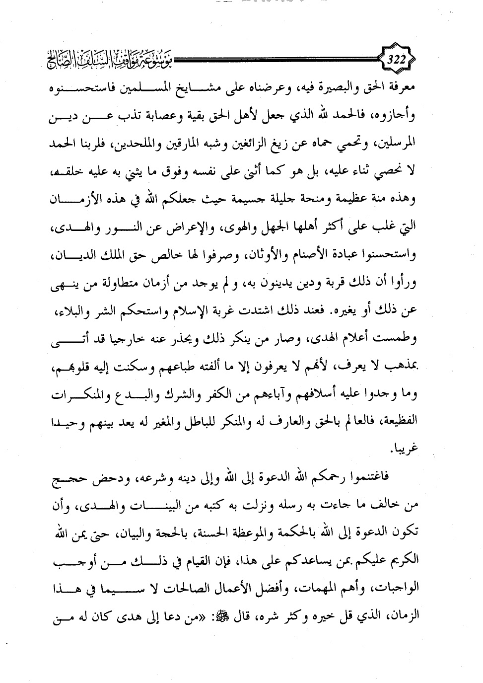 معرفة الحق والبصيرة فيه، وعرضناه على مشايخ المسلمين فاستحسنوه وأجازوه، فالحمد لله الذي جعل لأهل الحق بقية وعصابة تذب عن دين المرسلين، وتحمي حماه عن زيغ الزائغين وشبه المارقين والملحدين، فلربنا الحمد لا نحصي ثناء عليه، بل هو كما أثنى على نفسه وفوق ما يُثني به عليه خلقه، وهذه منة عظيمة ومنحة جليلة جسيمة حيث جعلكم الله في هذه الأزمان التي غلب على أكثر أهلها الجهل والهوى، والإعراض عن النور والهدى، واستحسنوا عبادة الأصنام والأوثان، وصرفوا لها خالص حق الملك الديان، ورأوا أن ذلك قربة ودين يدينون به، ولم يوجد من أزمان متطاولة من ينهى عن ذلك أو يغيره. فعند ذلك اشتدت غربة الإسلام واستحكم الشر والبلاء، وطمست أعلام الهدى، وصار من ينكر ذلك ويحذر عنه خارجيا قد أتى بمذهب لا يعرف، لأنهم لا يعرفون إلا ما ألفته طباعهم وسكنت إليه قلوبهم، وما وجدوا عليه أسلافهم وآباءهم من الكفر والشرك والبدع والمنكرات الفظيعة، فالعالم بالحق والعارف له والمنكر للباطل والمغير له يعد بينهم وحيدا غريبا.