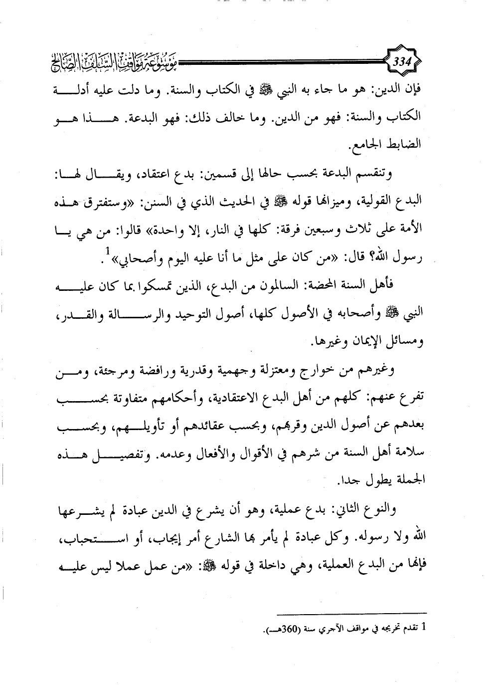 فإن الدين: هو ما جاء به النبي - صلى الله عليه وسلم - في الكتاب والسنة. وما دلت عليه أدلة الكتاب والسنة: فهو من الدين. وما خالف ذلك: فهو البدعة. هذا هو الضابط الجامع.