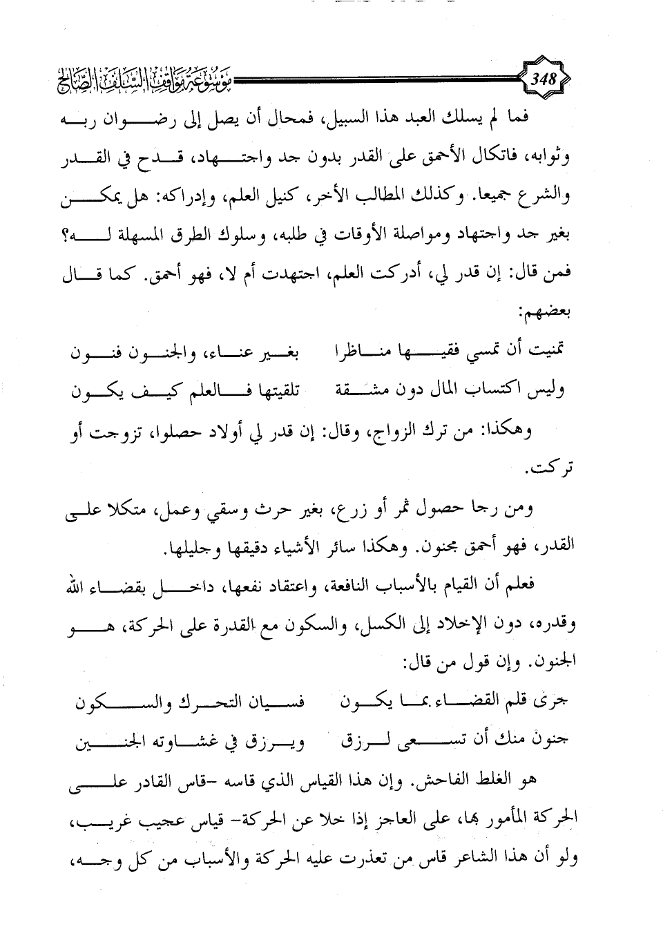 فما لم يسلك العبد هذا السبيل، فمحال أن يصل إلى رضوان ربه وثوابه، فاتكال الأحمق على القدر بدون جد واجتهاد، قدح في القدر والشرع جميعا. وكذلك المطالب الأخر، كنيل العلم، وإدراكه: هل يمكن بغير جد واجتهاد ومواصلة الأوقات في طلبه، وسلوك الطرق المسهلة له؟ فمن قال: إن قدر لي، أدركت العلم، اجتهدت أم لا، فهو أحمق. كما قال بعضهم: