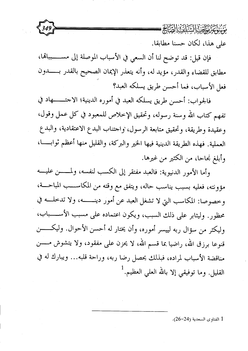 وأما الأمور الدنيوية: فالعبد مفتقر إلى الكسب لنفسه، ولمن عليه مؤونته، فعليه بسبب يناسب حاله، ويتفق مع وقته من المكاسب المباحة، وخصوصا: المكاسب التي لا تشغل العبد عن أمور دينه، ولا تدخله في محظور. وليثابر على ذلك السبب، ويكون اعتماده على مسبب الأسباب، وليكثر من سؤال ربه لييسر أموره، وأن يختار له أحسن الأحوال. وليكن قنوعا برزق الله، راضيا بما قسم الله، لا يحزن على مفقود، ولا يتشوش من مناقضة الأسباب لمراده، فبذلك يحصل رضا ربه، وراحة قلبه ... ويبارك له في القليل. وما توفيقي إلا بالله العلي العظيم. (¬1)