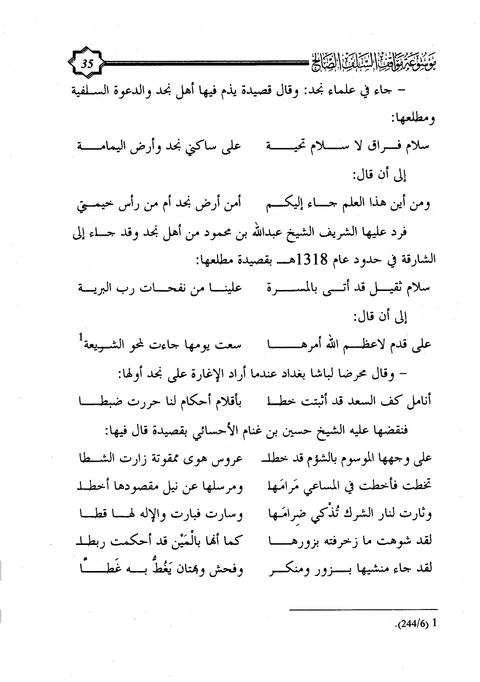 - جاء في علماء نجد: وقال قصيدة يذم فيها أهل نجد والدعوة السلفية ومطلعها: