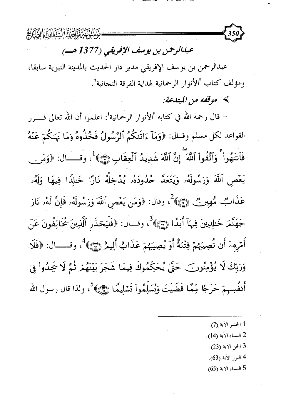 عبد الرحمن بن يوسف الإفريقي مدير دار الحديث بالمدينة النبوية سابقا، ومؤلف كتاب 'الأنوار الرحمانية لهداية الفرقة التجانية'.